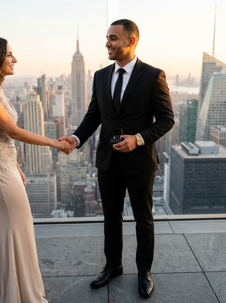 Luxury engagement photoshoot in a cityscape. Model wearing a tailored suit . Standing on a rooftop with a skyline view, high-end engagement photography.