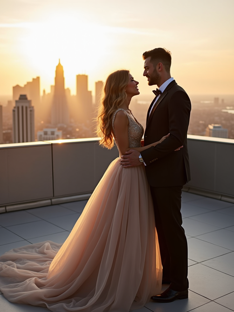 Luxury engagement photoshoot in a cityscape. Wearing a classy evening gown . Standing on a rooftop with a skyline view, high-end engagement photography.