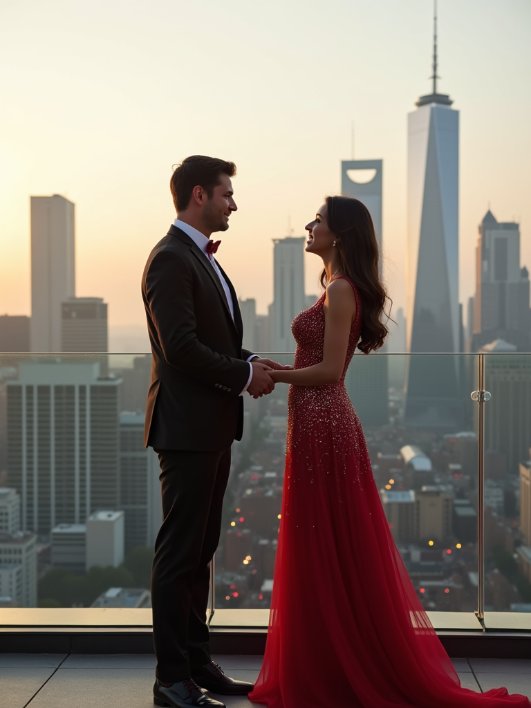 Luxury engagement photoshoot in a cityscape. Wearing a classy evening gown . Standing on a rooftop with a skyline view, high-end engagement photography.