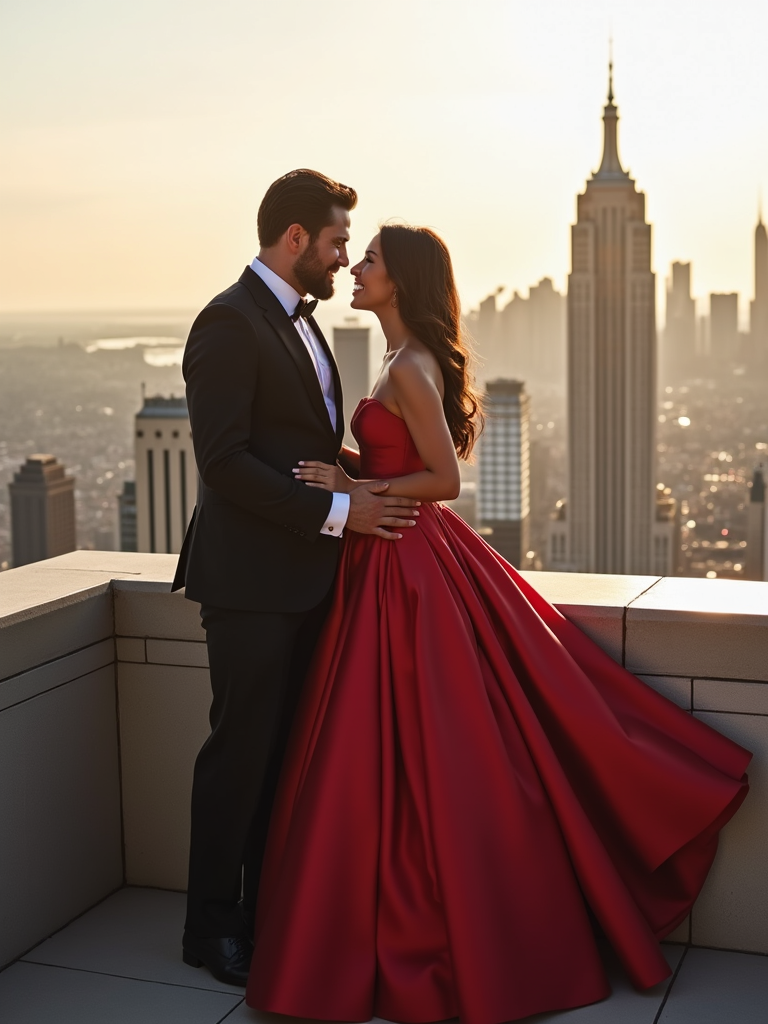 Luxury engagement photoshoot in a cityscape. Wearing a classy evening gown . Standing on a rooftop with a skyline view, high-end engagement photography.