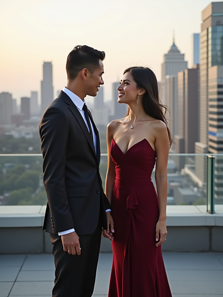 Luxury engagement photoshoot in a cityscape. Wearing a classy evening gown . Standing on a rooftop with a skyline view, high-end engagement photography.