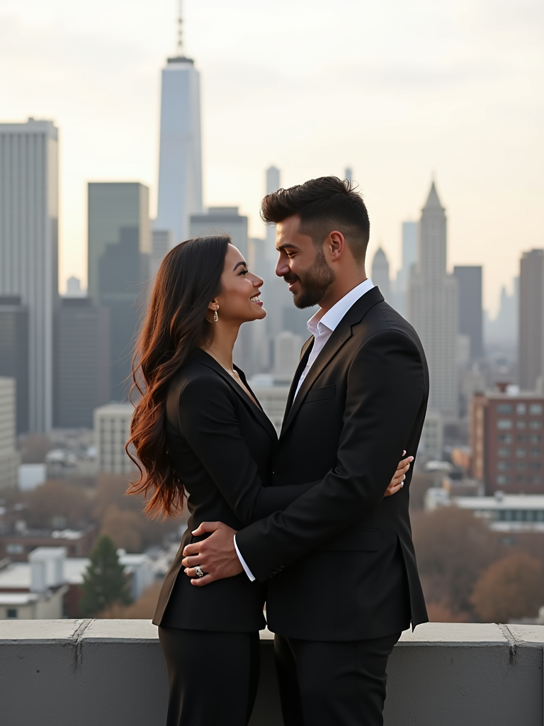 Luxury engagement photoshoot in a cityscape. Wearing a tailored suit . Standing on a rooftop with a skyline view, high-end engagement photography.