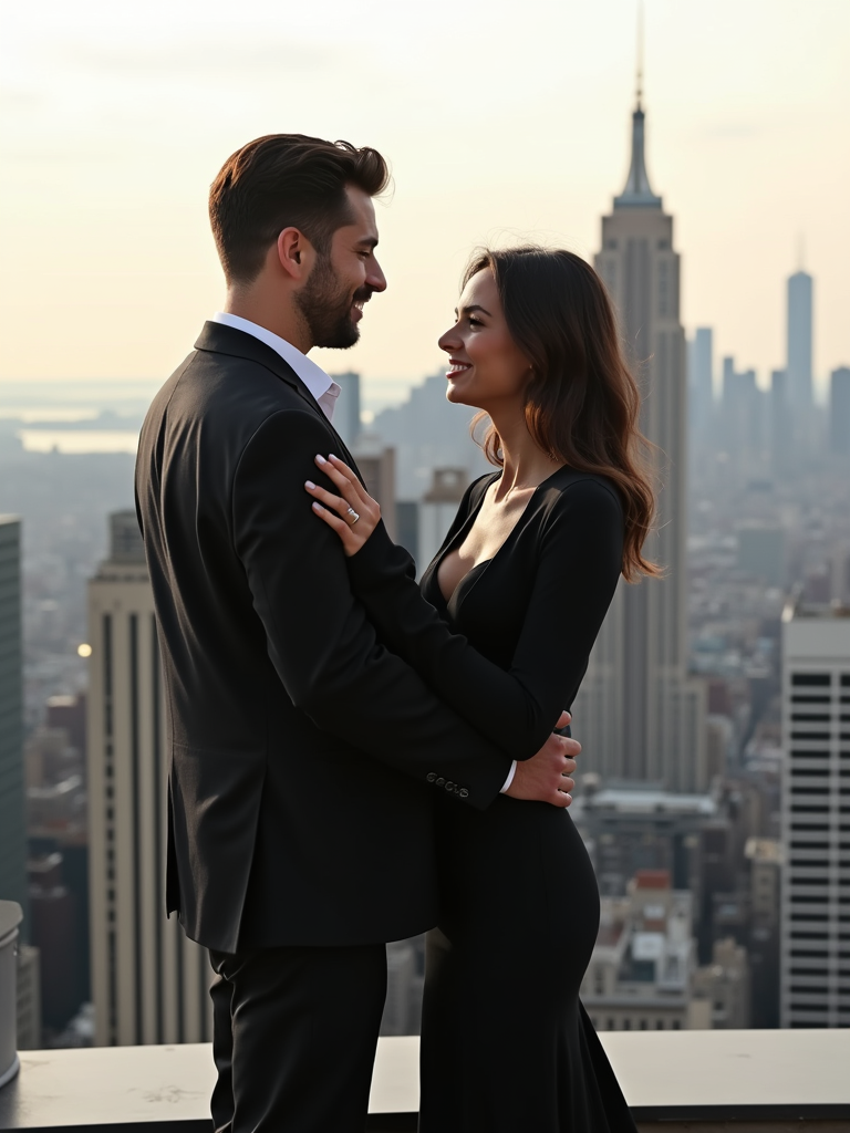 Luxury engagement photoshoot in a cityscape. Wearing a tailored suit . Standing on a rooftop with a skyline view, high-end engagement photography.