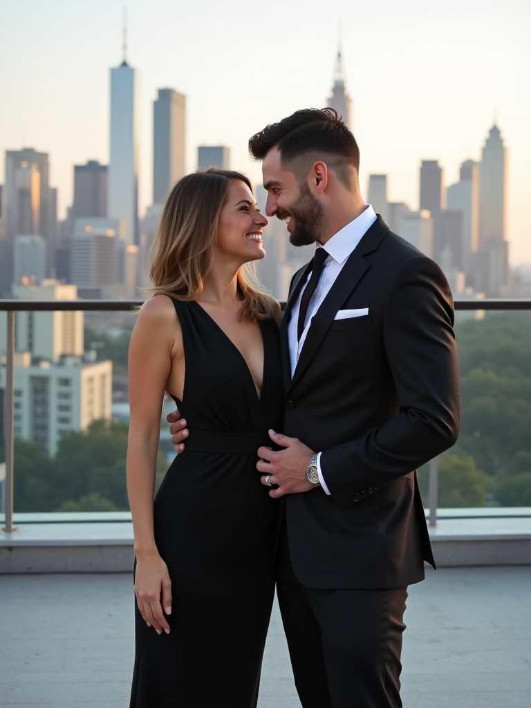 Luxury engagement photoshoot in a cityscape. Wearing a tailored suit . Standing on a rooftop with a skyline view, high-end engagement photography.
