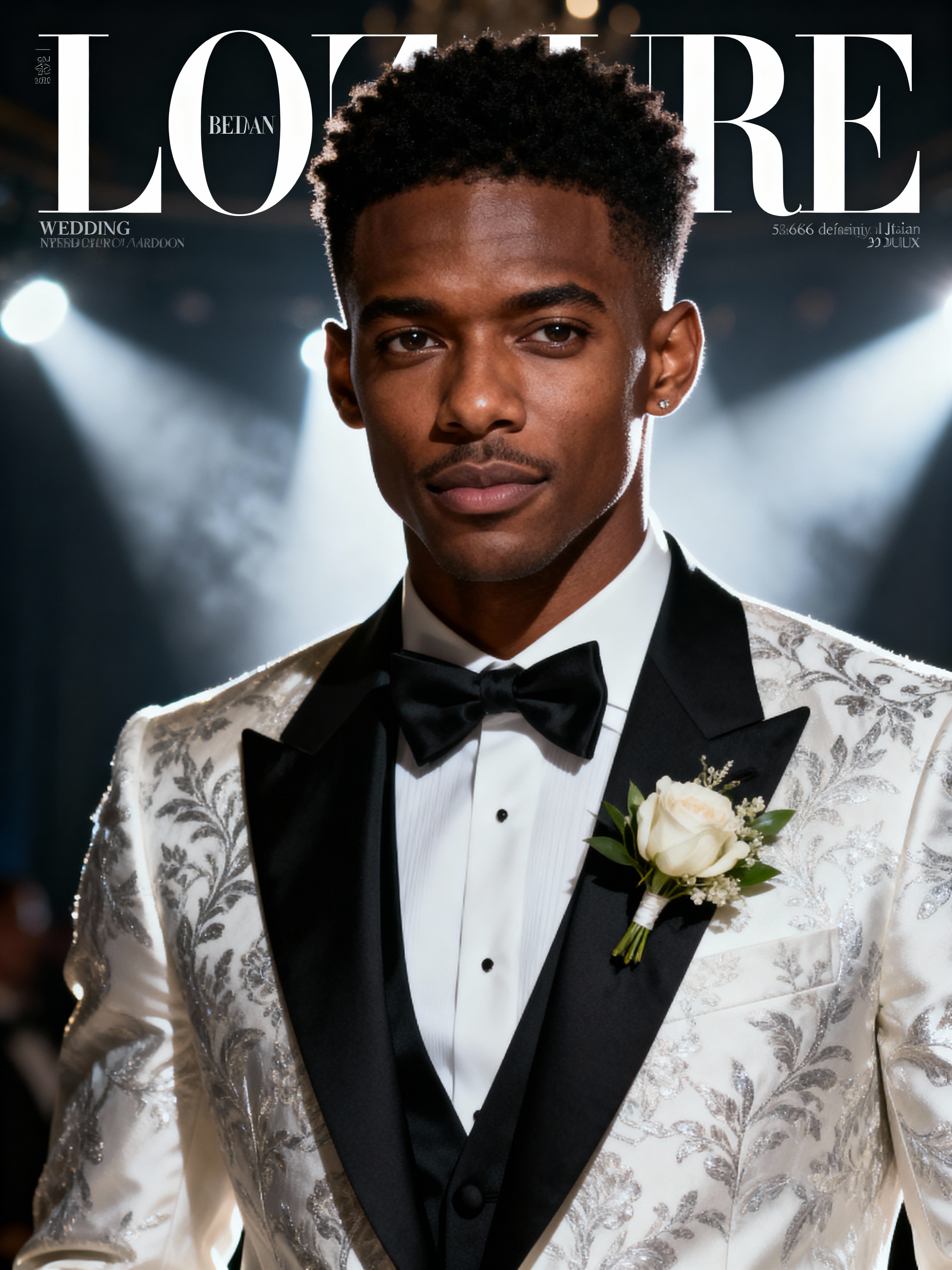 Luxury wedding magazine cover photoshoot, high-end fashion aesthetic. Model wearing an expensive Italian wedding suit with boutonnière, styled impeccably .