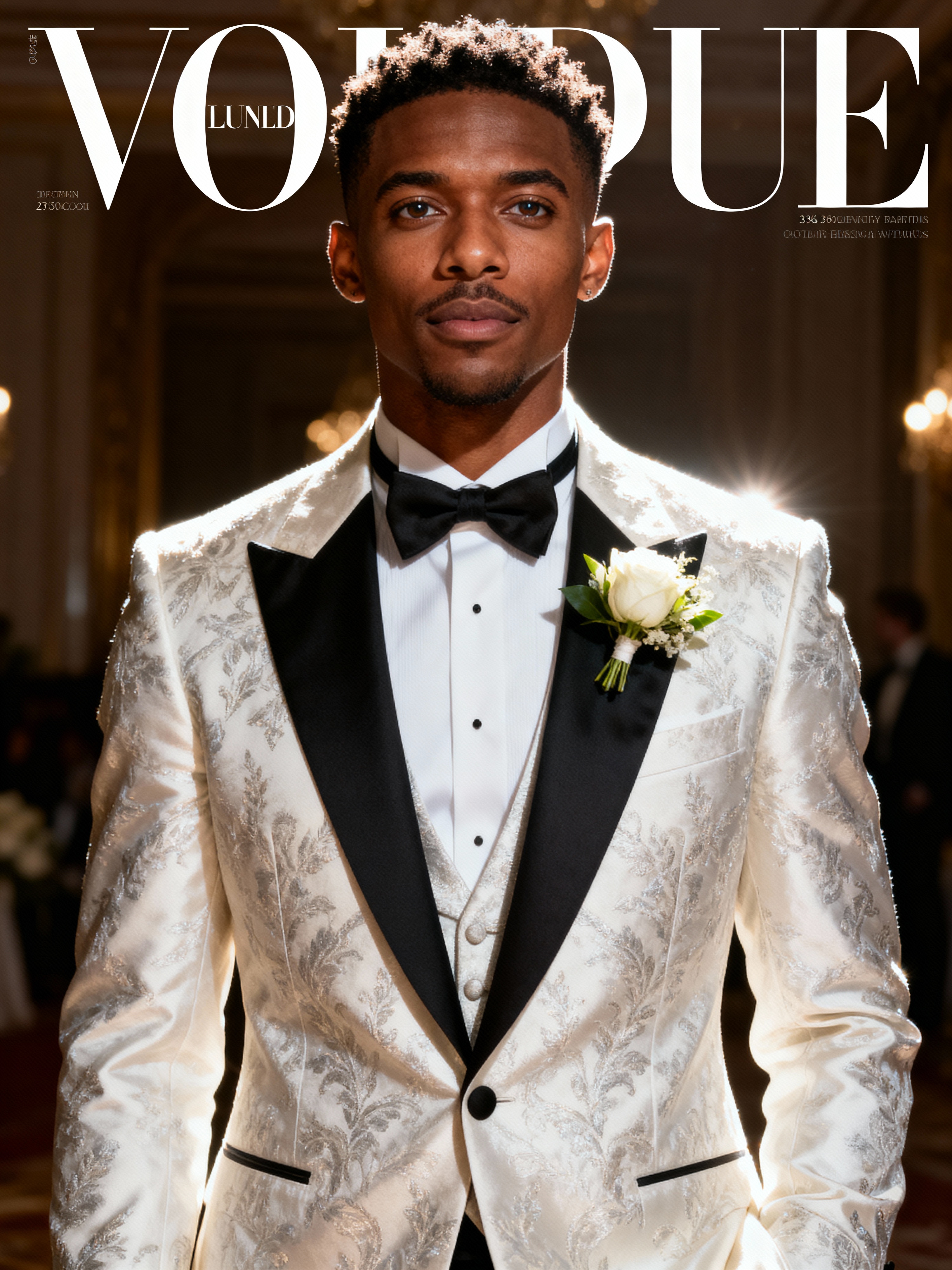 Luxury wedding magazine cover photoshoot, high-end fashion aesthetic. Model wearing an expensive Italian wedding suit with boutonnière, styled impeccably .