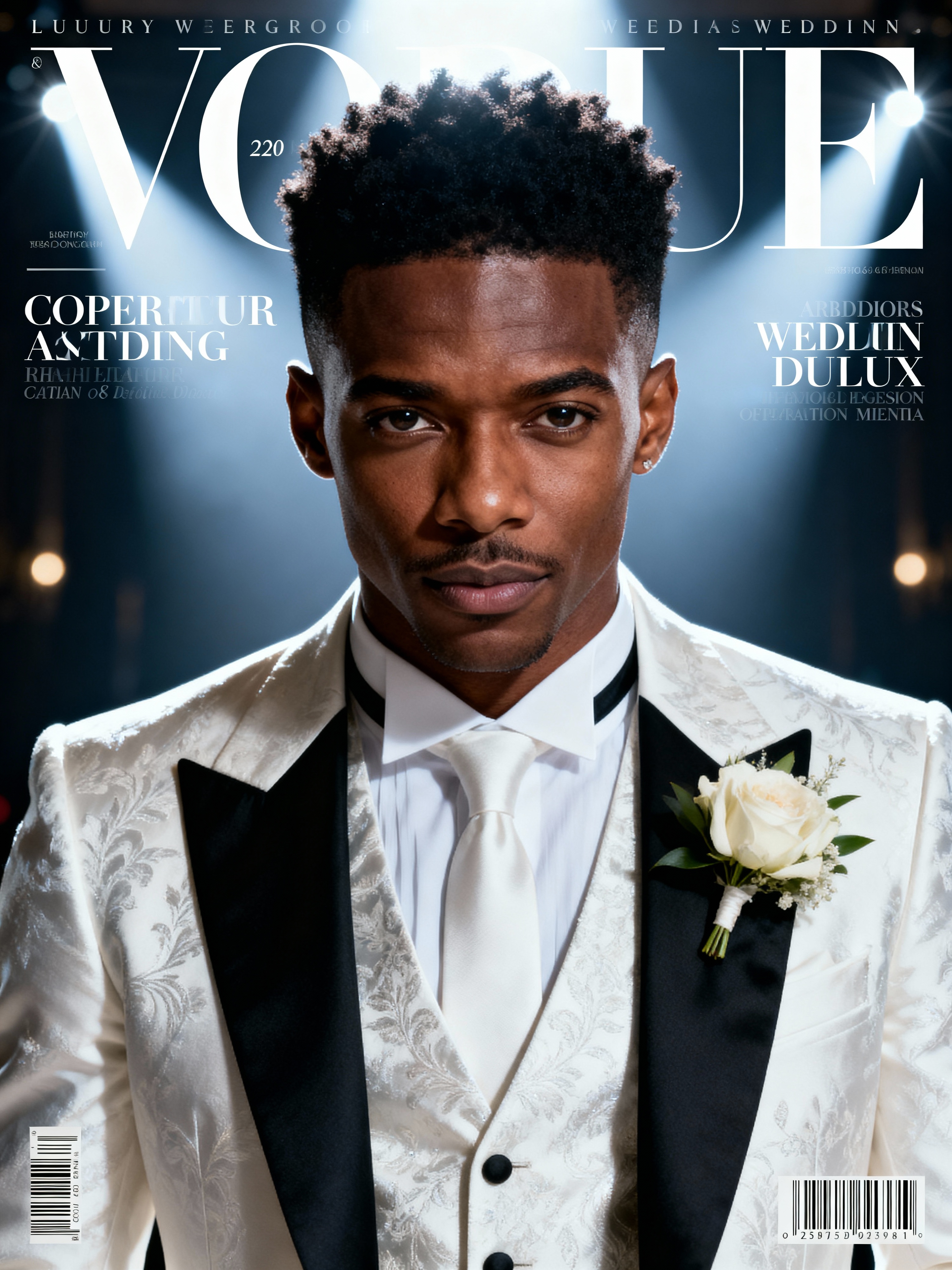 Luxury wedding magazine cover photoshoot, high-end fashion aesthetic. Model wearing an expensive Italian wedding suit with boutonnière, styled impeccably .