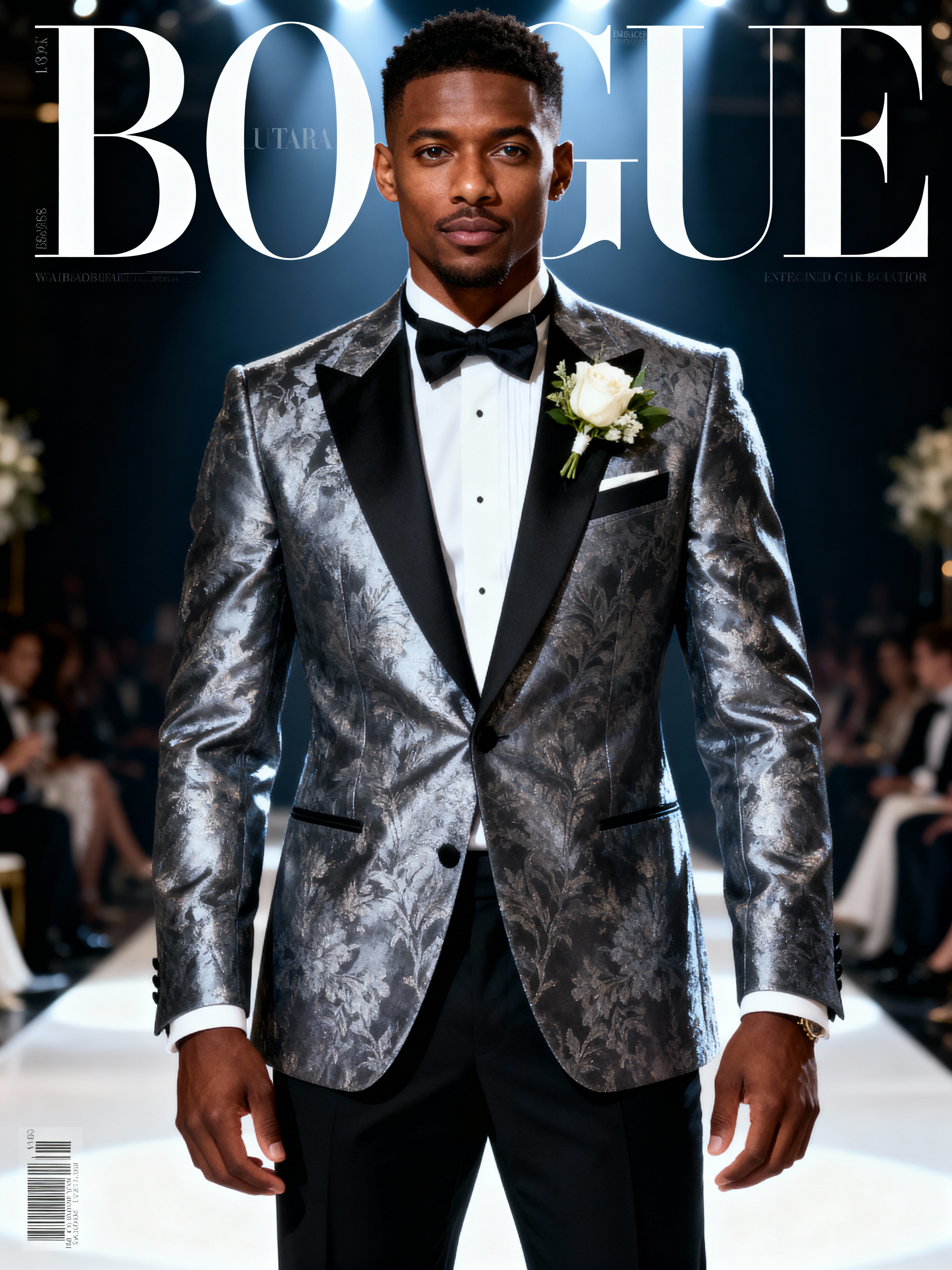 Luxury wedding magazine cover photoshoot, high-end fashion aesthetic. Model wearing an expensive Italian wedding suit with boutonnière, styled impeccably .