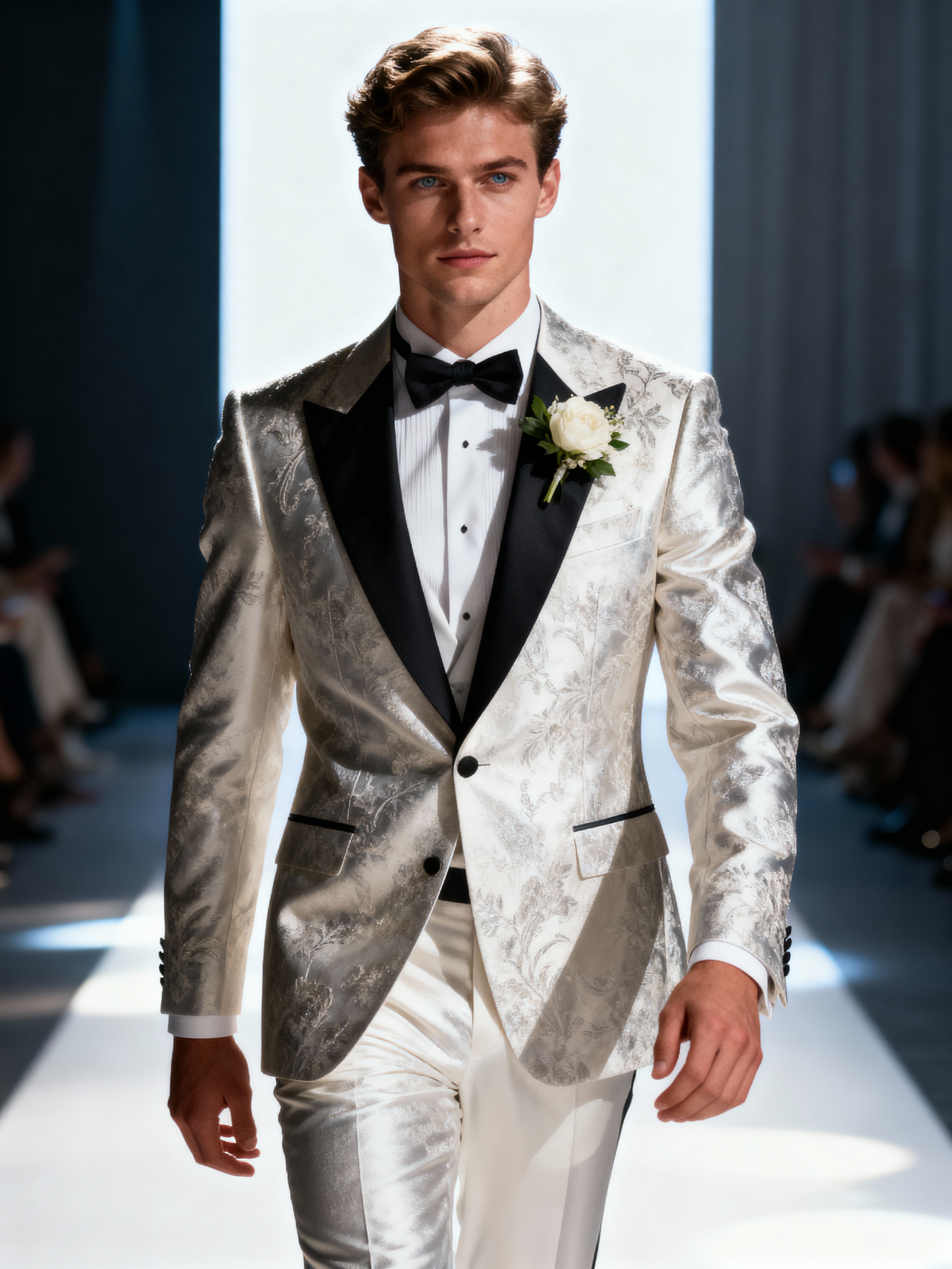 Luxury wedding magazine cover photoshoot, high-end fashion aesthetic. Model wearing an expensive Italian wedding suit with boutonnière, styled impeccably .