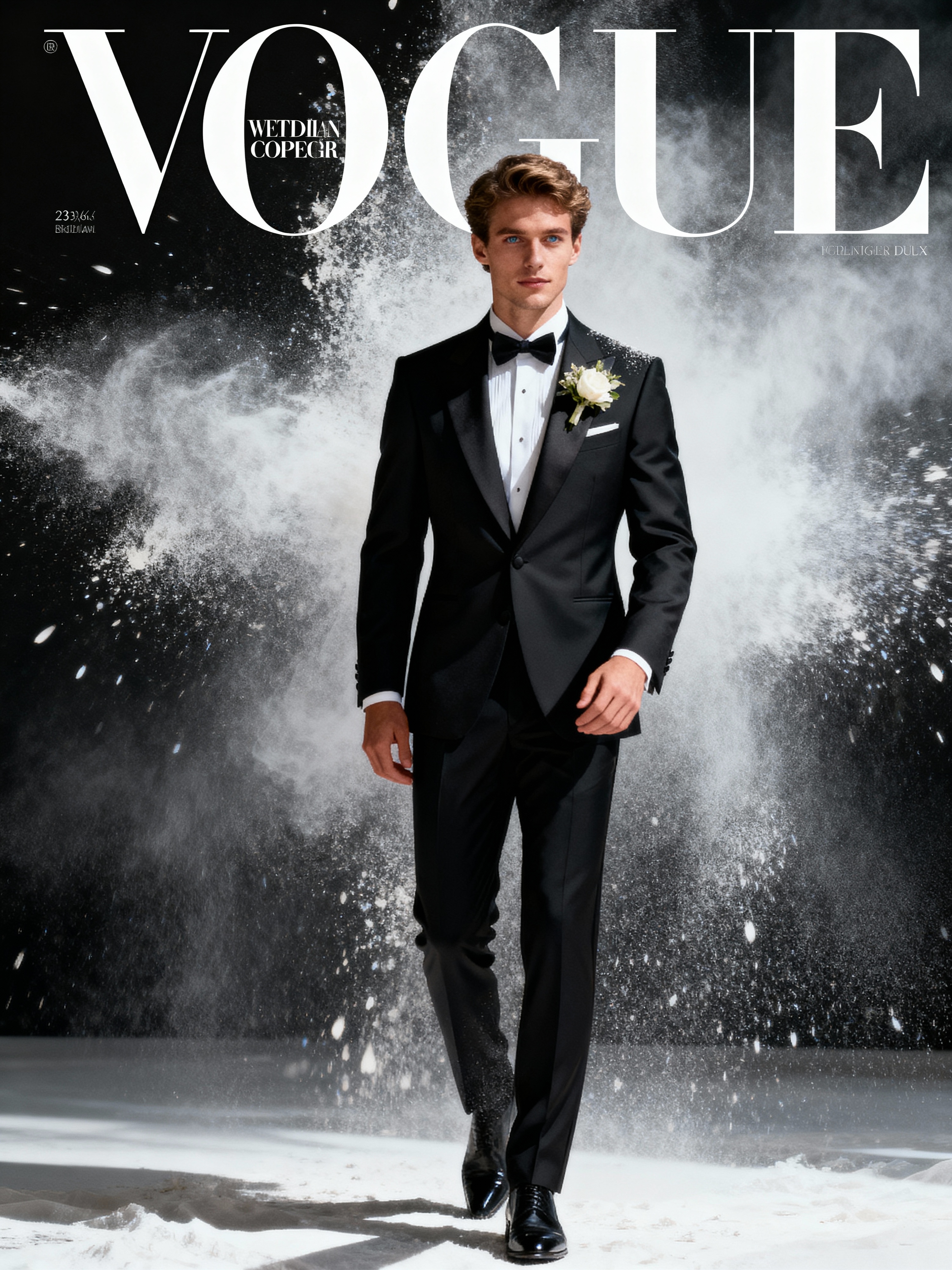 Luxury wedding magazine cover photoshoot, high-end fashion aesthetic. Model wearing an expensive Italian wedding suit with boutonnière, styled impeccably .