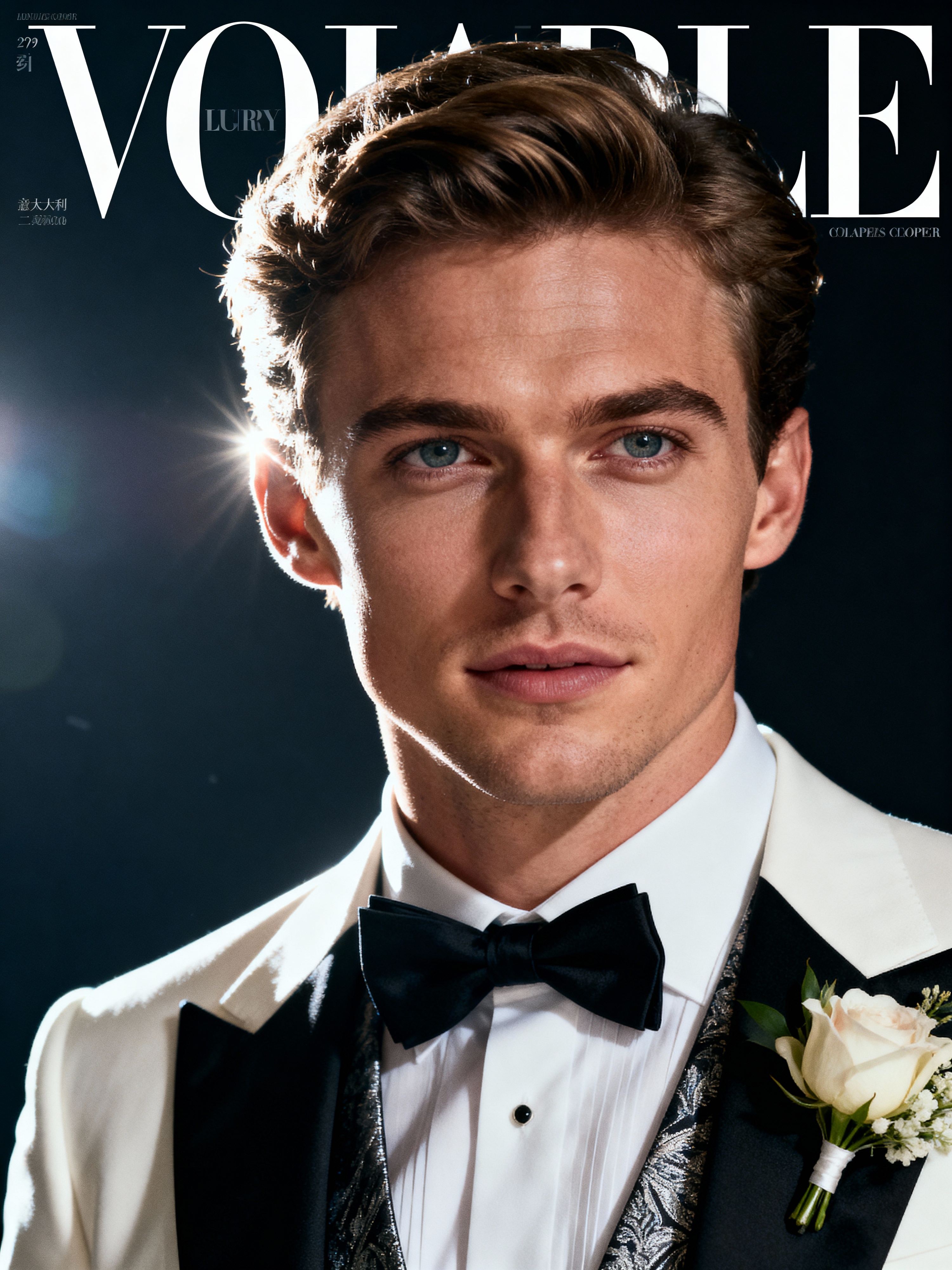 Luxury wedding magazine cover photoshoot, high-end fashion aesthetic. Model wearing an expensive Italian wedding suit with boutonnière, styled impeccably .