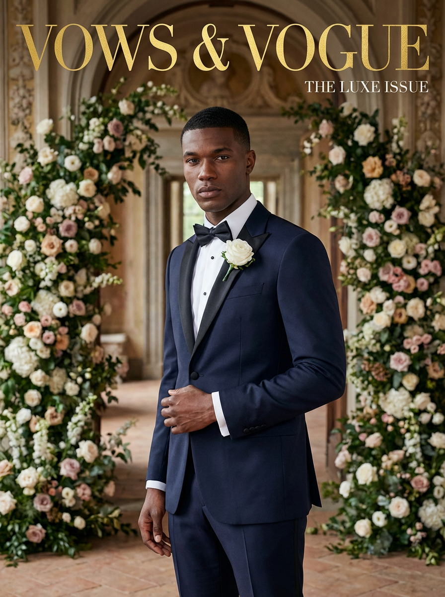 Luxury wedding magazine cover photoshoot, high-end fashion aesthetic. Model wearing an expensive Italian wedding suit with boutonnière, styled impeccably .