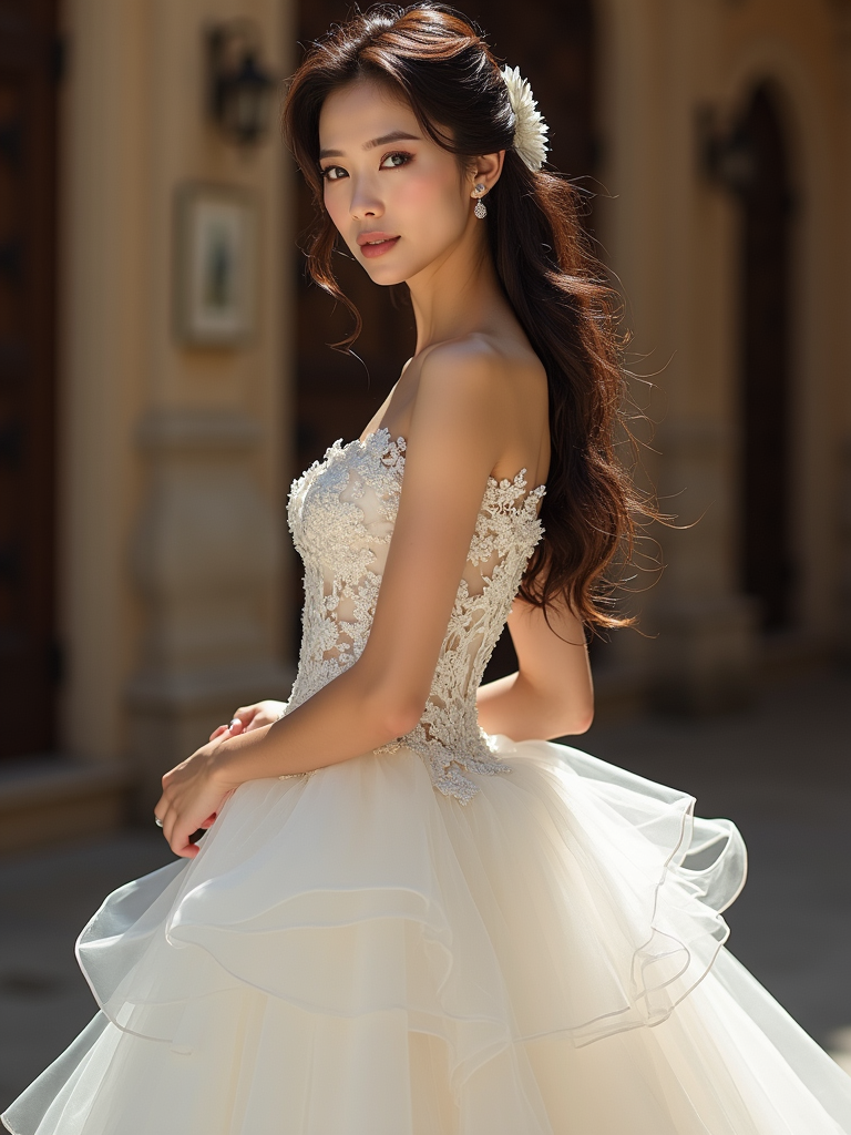 Luxury wedding magazine cover photoshoot, high-end fashion aesthetic. Model wearing a couture wedding dress, hair styled in soft waves .