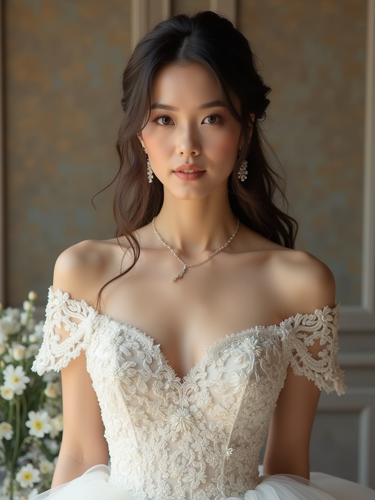 Luxury wedding magazine cover photoshoot, high-end fashion aesthetic. Model wearing a couture wedding dress, hair styled in soft waves .