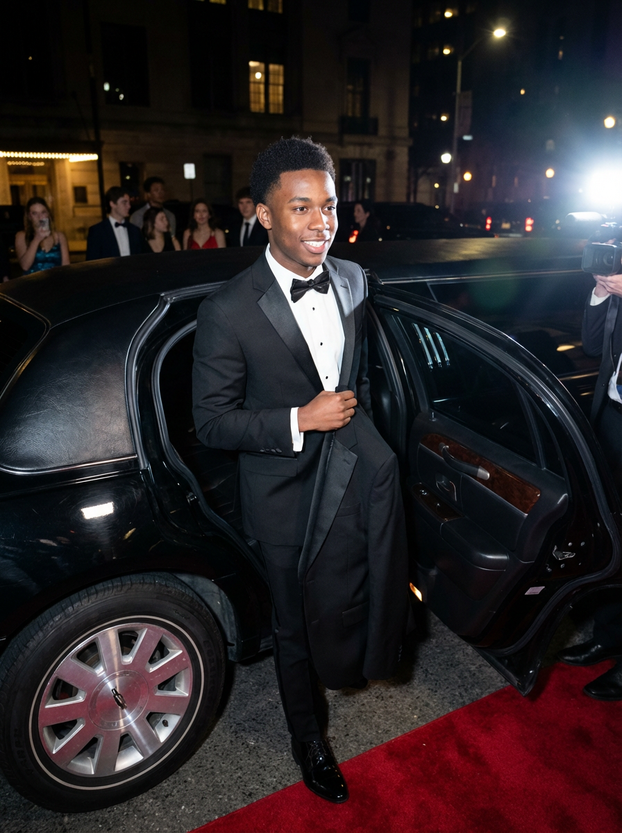 model arriving at prom in style, confident tux entrance, limousine or nice car visible