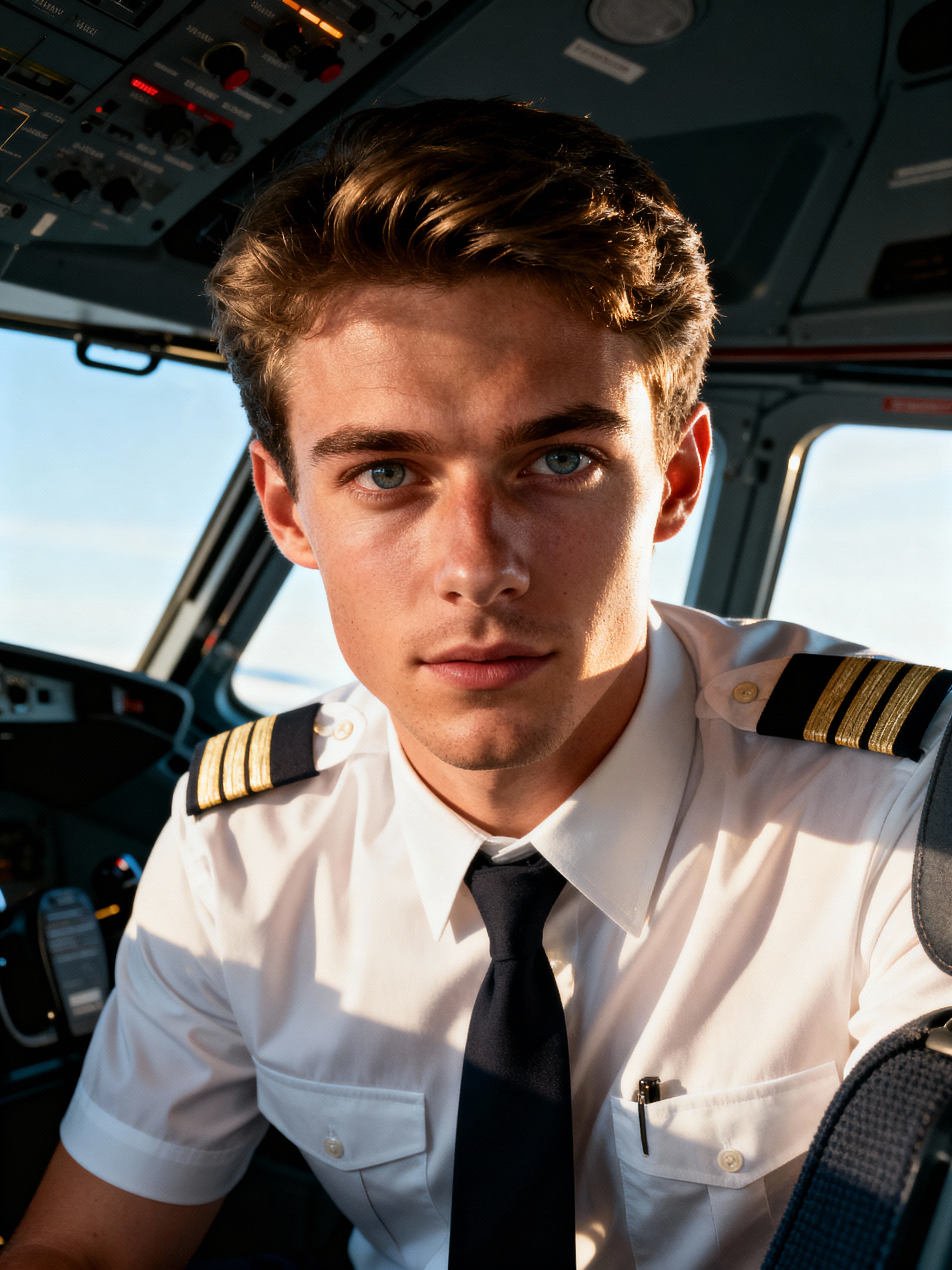 model as a Airline Pilot inside the Cockpit with white shirt Pilot Uniform
