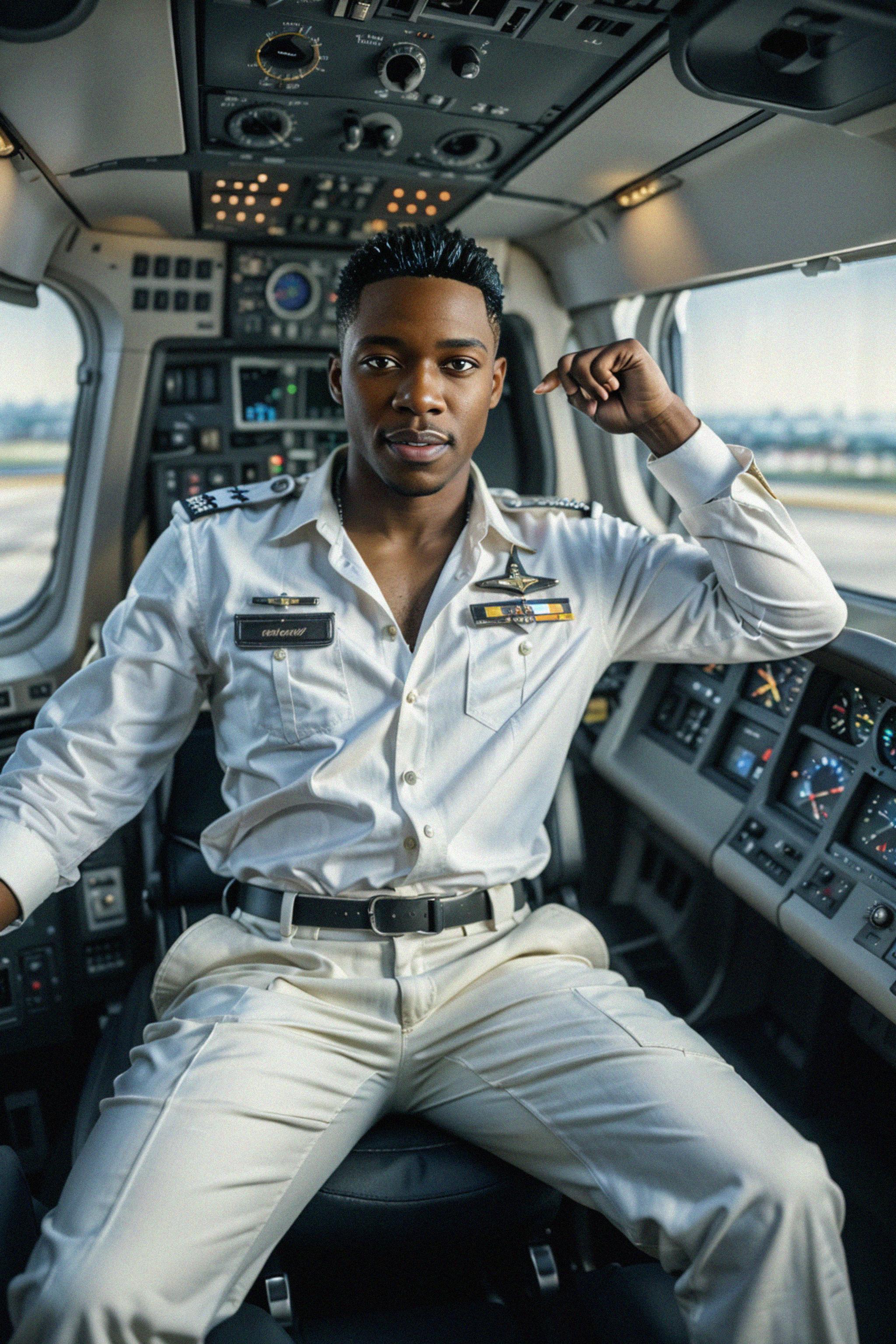 model as a Airline Pilot inside the Cockpit with white shirt Pilot Uniform