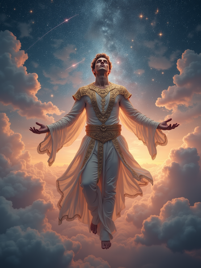 model as a celestial god in cosmic royal attire floating among clouds with constellation patterns and shooting stars in a twilight fantasy sky