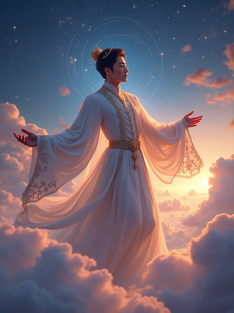 model as a celestial god in cosmic royal attire floating among clouds with constellation patterns and shooting stars in a twilight fantasy sky