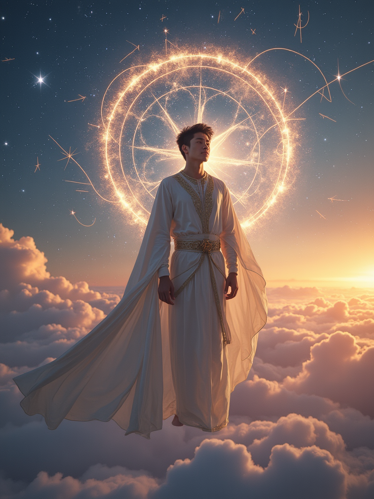 model as a celestial god in cosmic royal attire floating among clouds with constellation patterns and shooting stars in a twilight fantasy sky