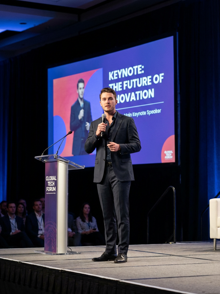 model as a conference keynote speaker standing on stage at a conference