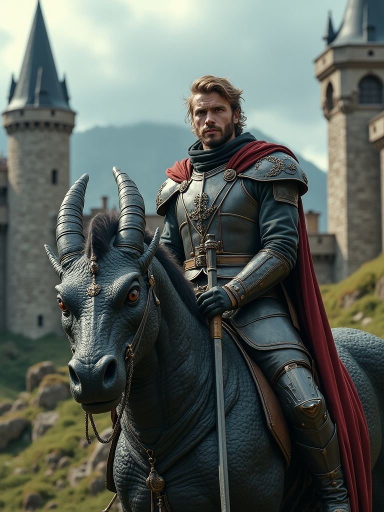 model as a dragon rider warrior in fantasy armor standing next to a friendly dragon in front of a medieval fantasy castle with dramatic cloudy skies