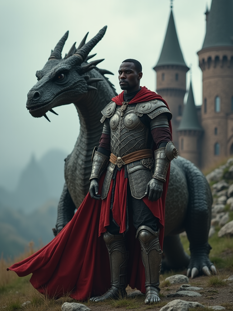 model as a dragon rider warrior in fantasy armor standing next to a friendly dragon in front of a medieval fantasy castle with dramatic cloudy skies