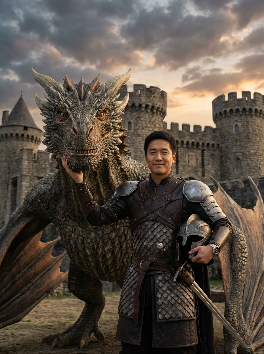 model as a dragon rider warrior in fantasy armor standing next to a friendly dragon in front of a medieval fantasy castle with dramatic cloudy skies