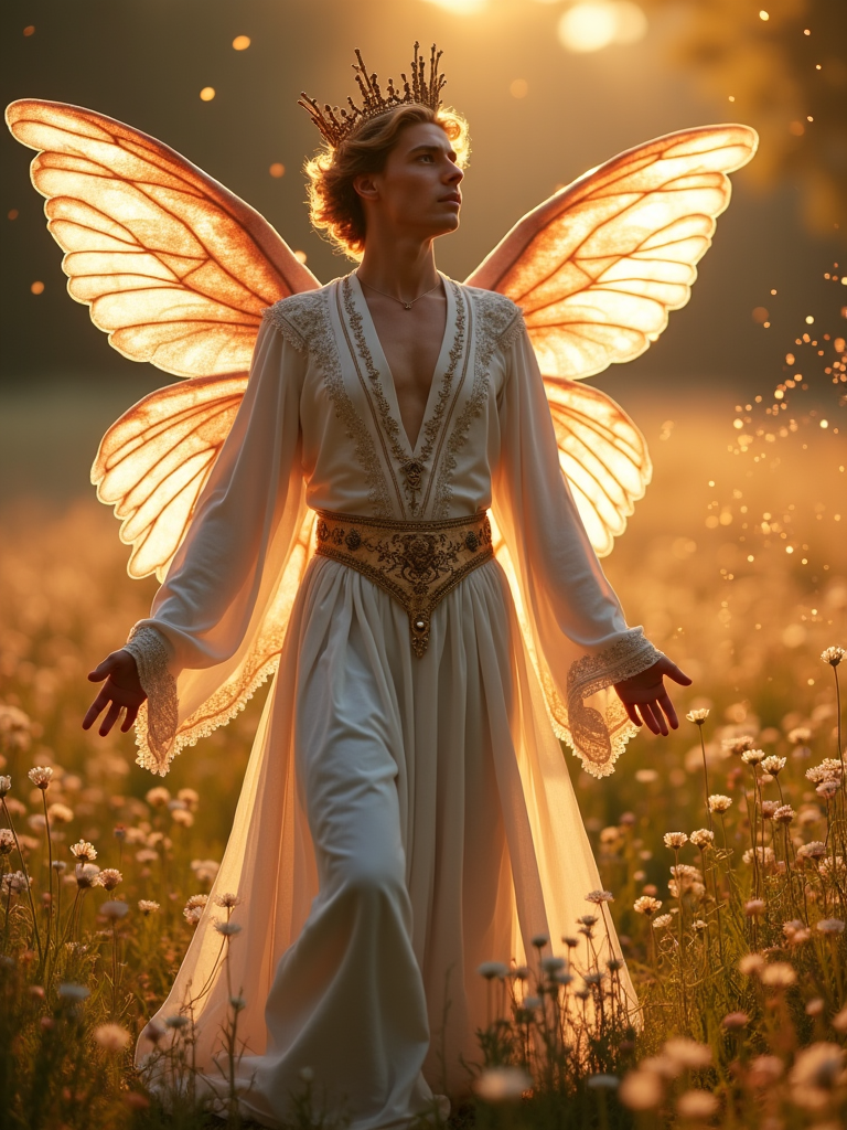model as a fairy king with majestic wings wearing nature-inspired royal robes standing in a flower meadow with magical golden hour lighting and floating sparkles