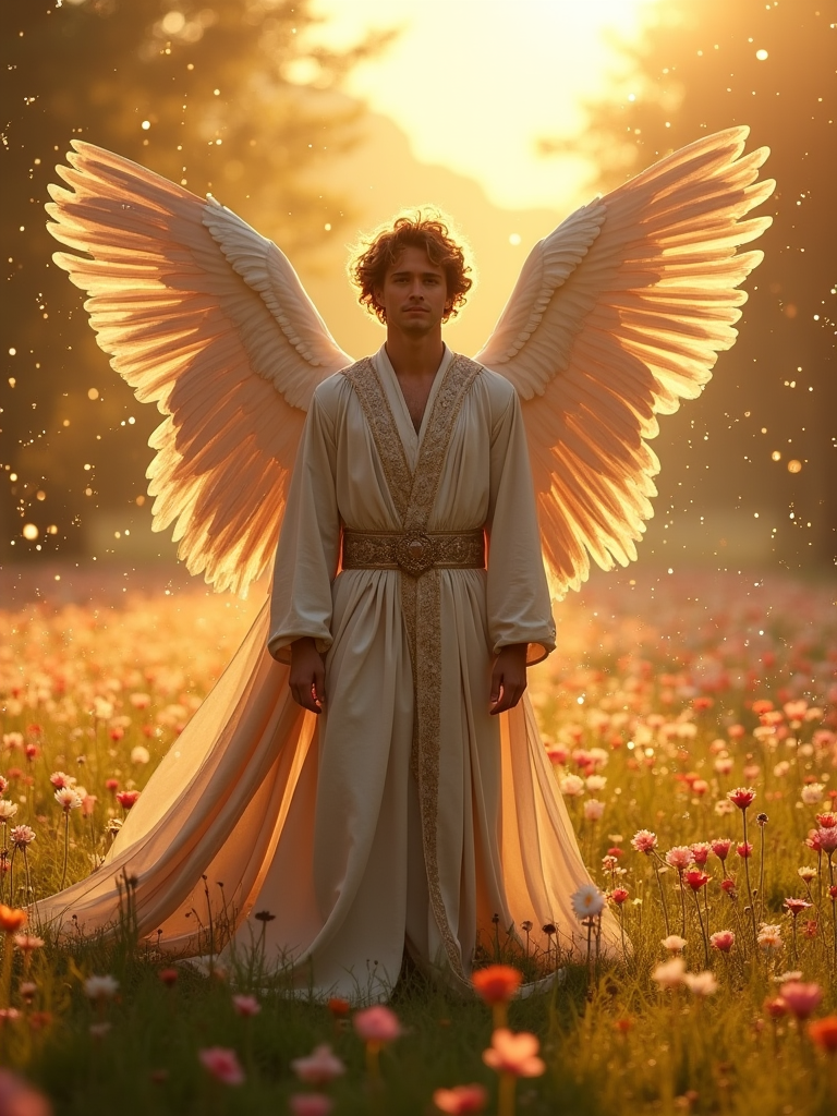 model as a fairy king with majestic wings wearing nature-inspired royal robes standing in a flower meadow with magical golden hour lighting and floating sparkles