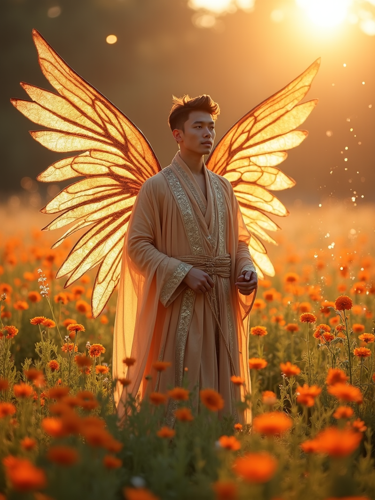 model as a fairy king with majestic wings wearing nature-inspired royal robes standing in a flower meadow with magical golden hour lighting and floating sparkles