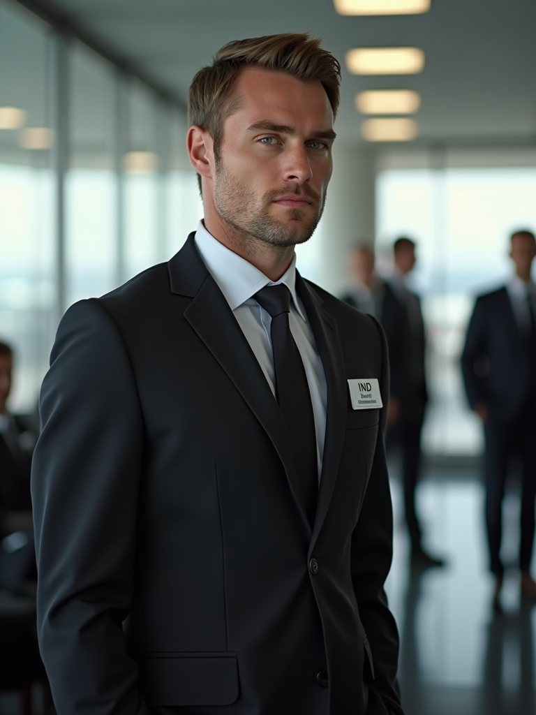 model as a flight attendant at airport briefing room, wearing an imposing figure in a sharp flight attendant uniform with name tag and muscular frame, preparing for flight with colleagues