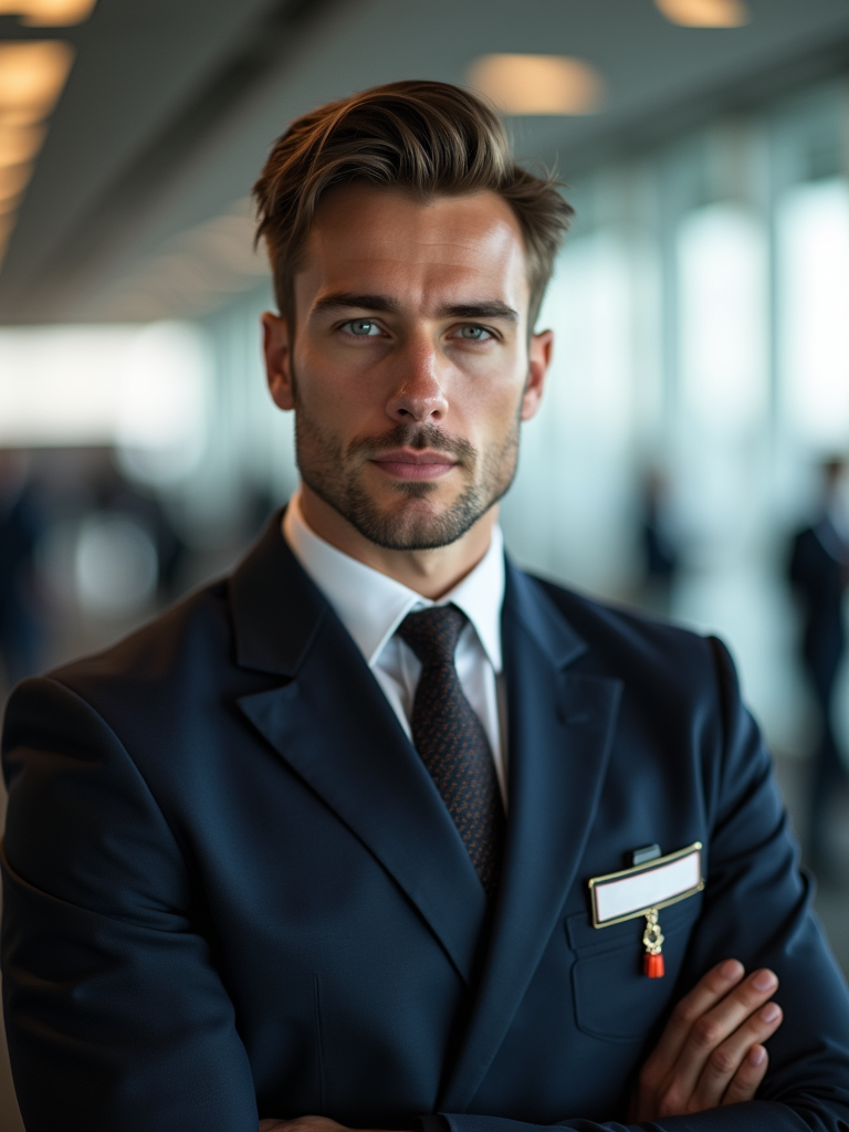 model as a flight attendant at airport briefing room, wearing an imposing figure in a sharp flight attendant uniform with name tag and muscular frame, preparing for flight with colleagues