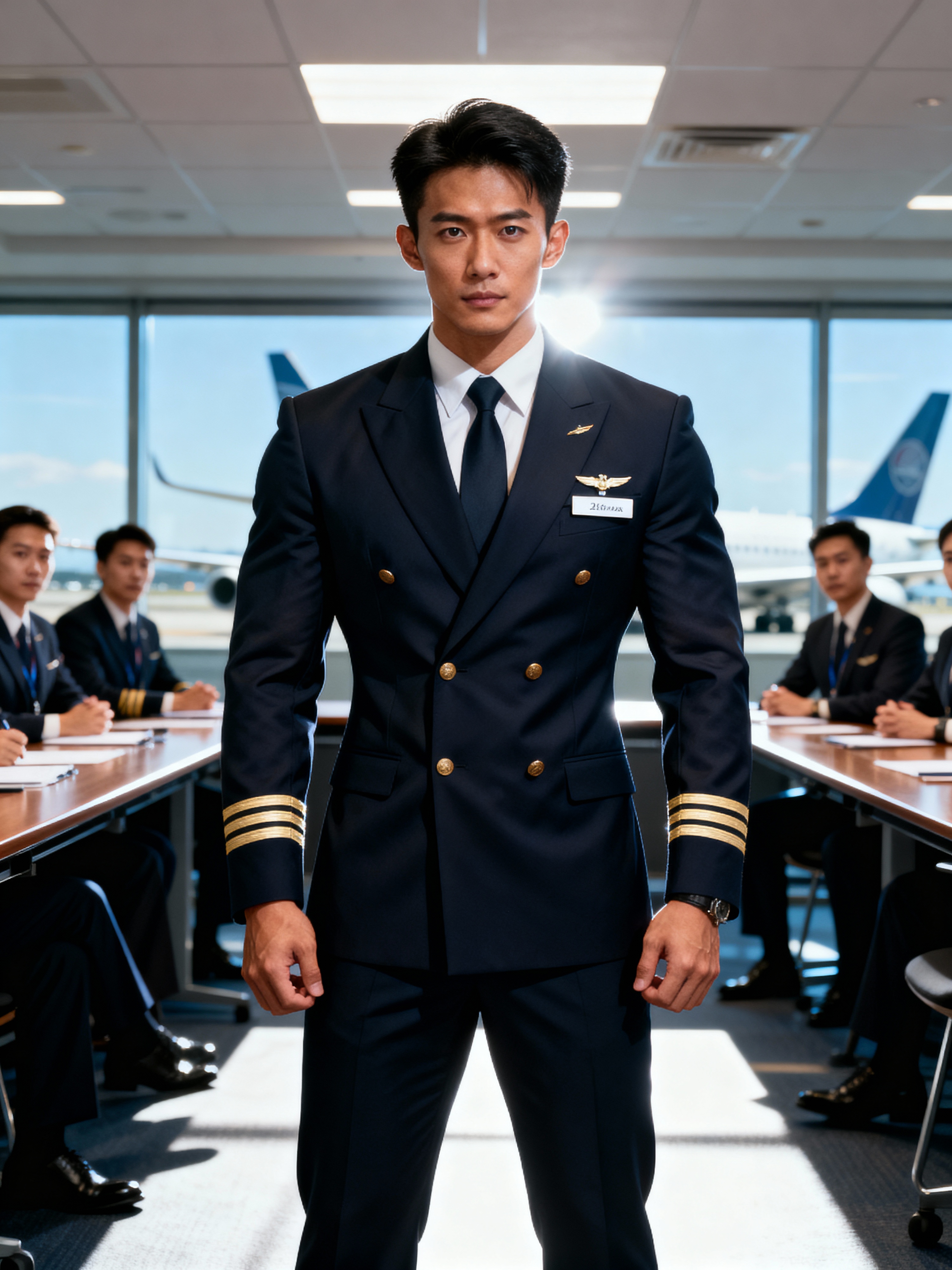 model as a flight attendant at airport briefing room, wearing an imposing figure in a sharp flight attendant uniform with name tag and muscular frame, preparing for flight with colleagues