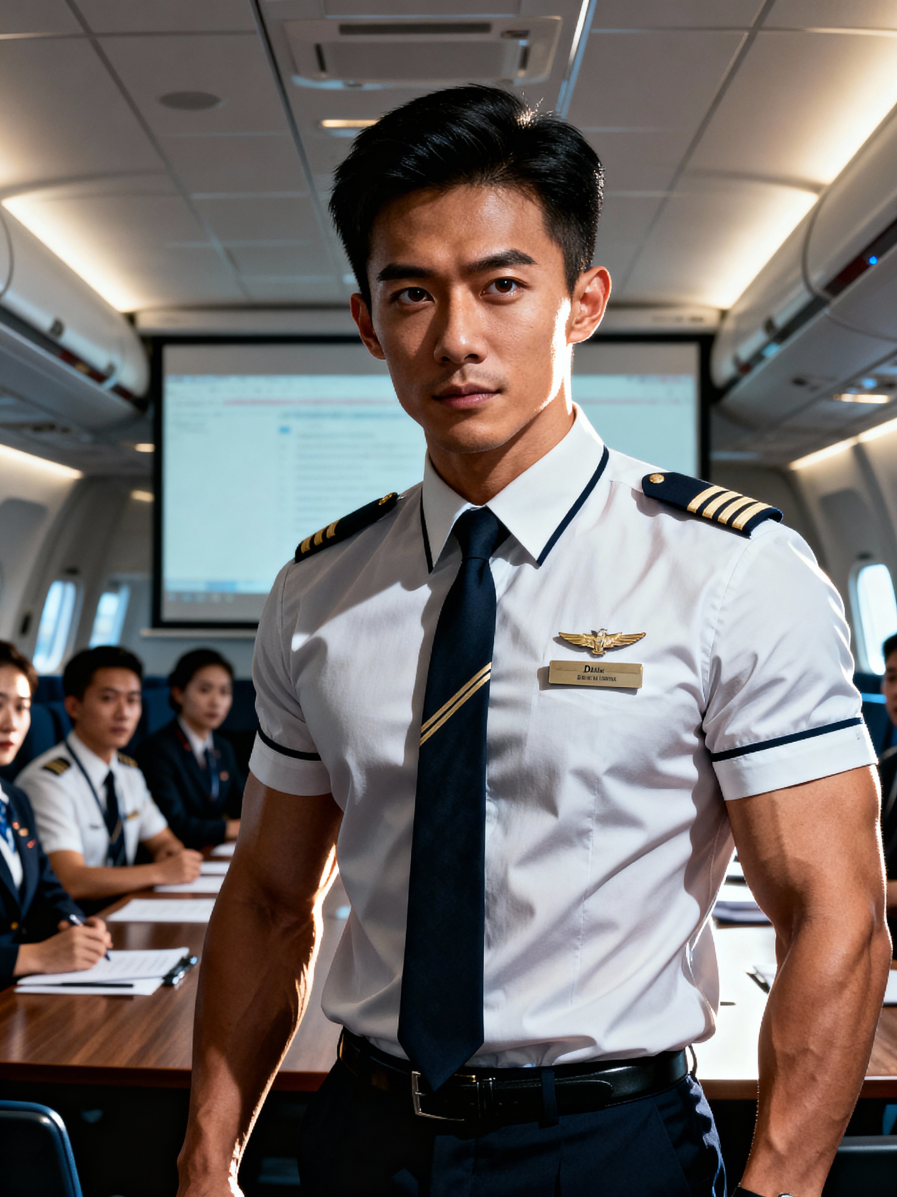 model as a flight attendant at airport briefing room, wearing an imposing figure in a sharp flight attendant uniform with name tag and muscular frame, preparing for flight with colleagues
