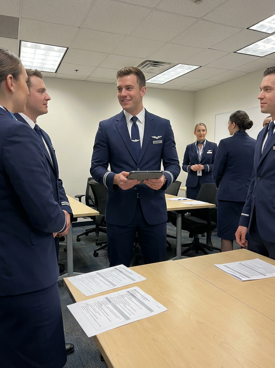 model as a flight attendant at airport briefing room, wearing an imposing figure in a sharp flight attendant uniform with name tag and muscular frame, preparing for flight with colleagues