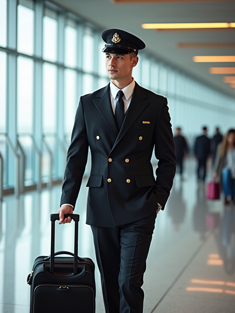 model as a flight attendant at airport terminal, wearing a commanding presence in a sharp flight attendant uniform with cap and broad chest, confidently pulling cabin luggage through international terminal