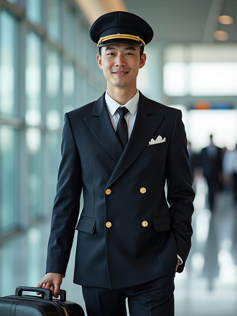 model as a flight attendant at airport terminal, wearing a commanding presence in a sharp flight attendant uniform with cap and broad chest, confidently pulling cabin luggage through international terminal
