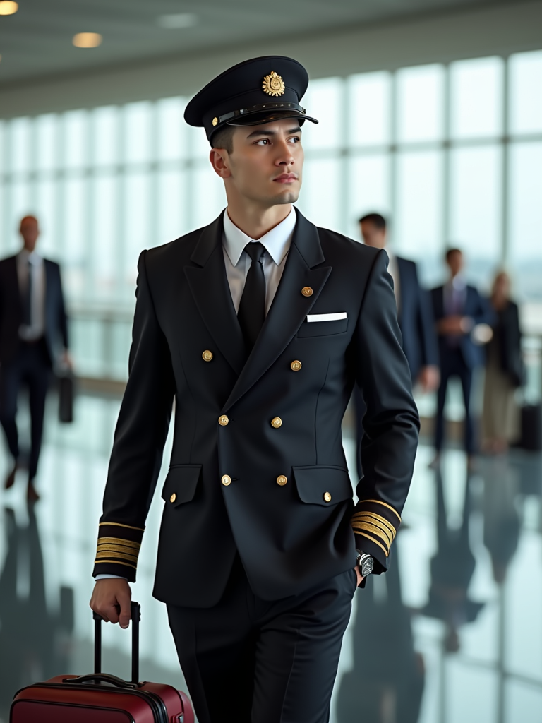 model as a flight attendant at airport terminal, wearing a commanding presence in a sharp flight attendant uniform with cap and broad chest, confidently pulling cabin luggage through international terminal