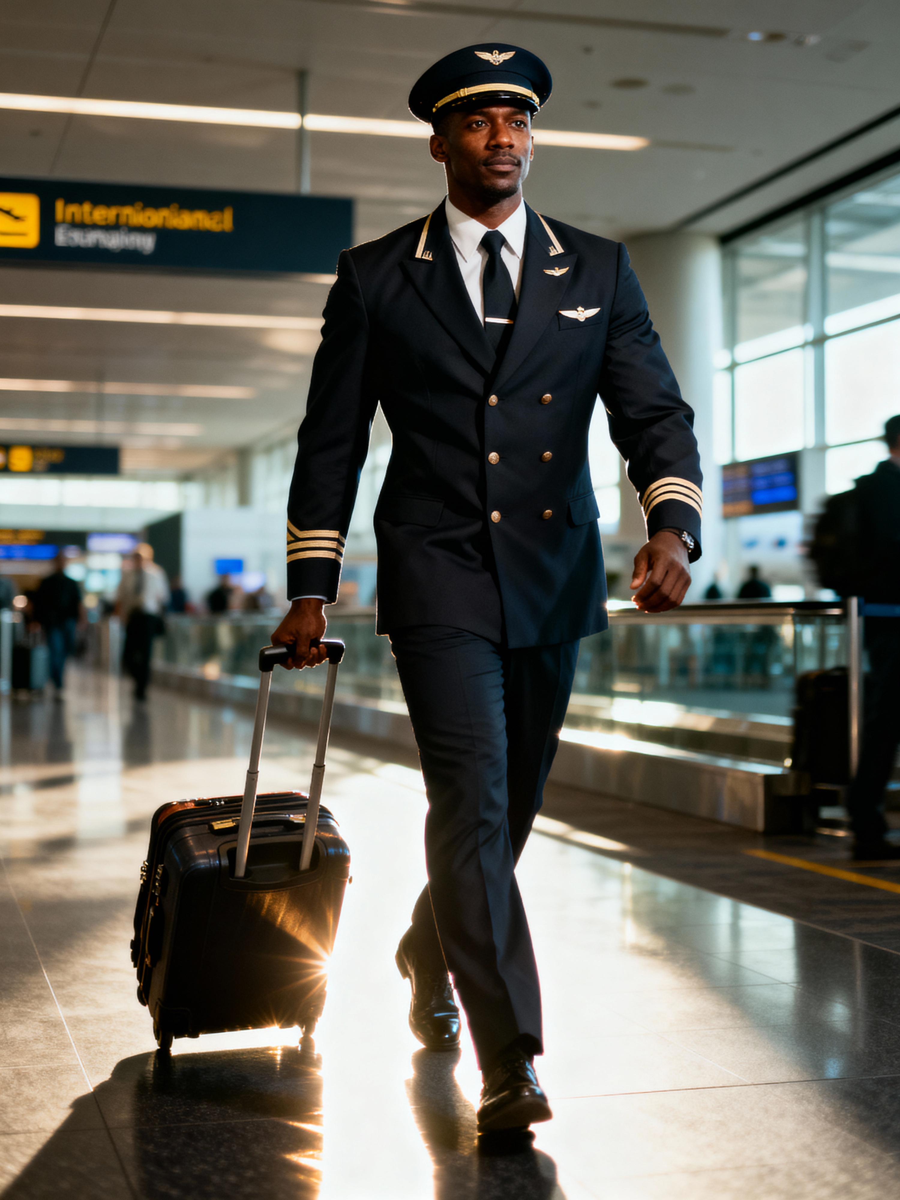 model as a flight attendant at airport terminal, wearing a commanding presence in a sharp flight attendant uniform with cap and broad chest, confidently pulling cabin luggage through international terminal
