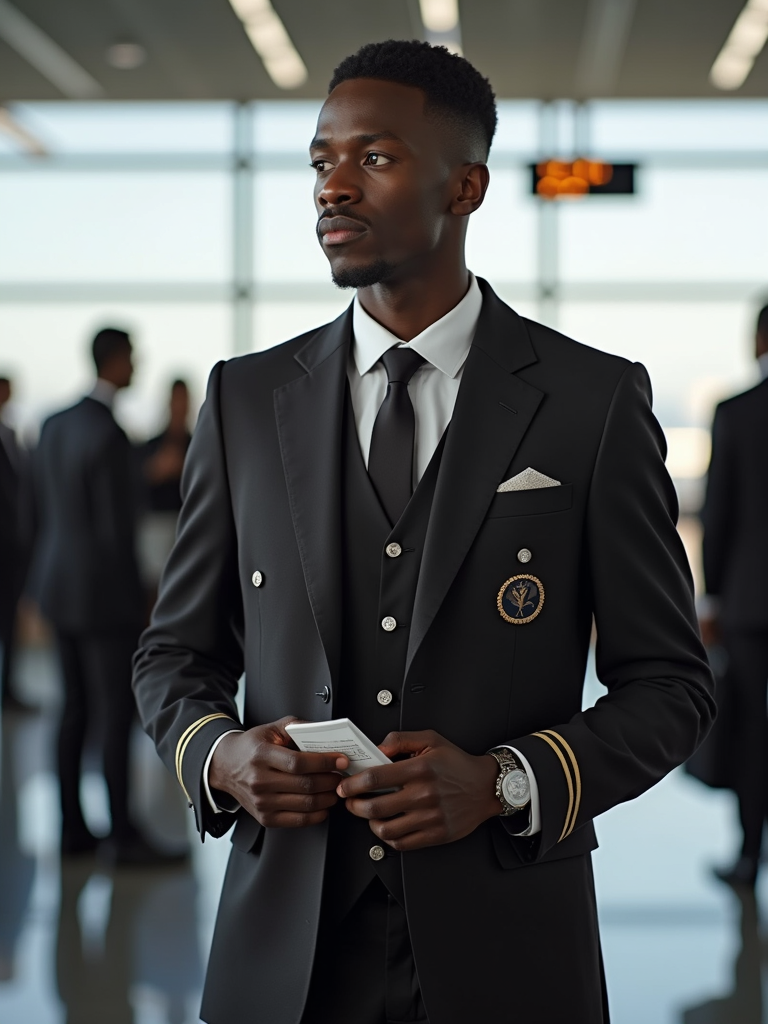 model as a flight attendant at boarding gate, wearing a commanding presence in a professional flight attendant uniform with groomed appearance and strong jawline, checking boarding passes