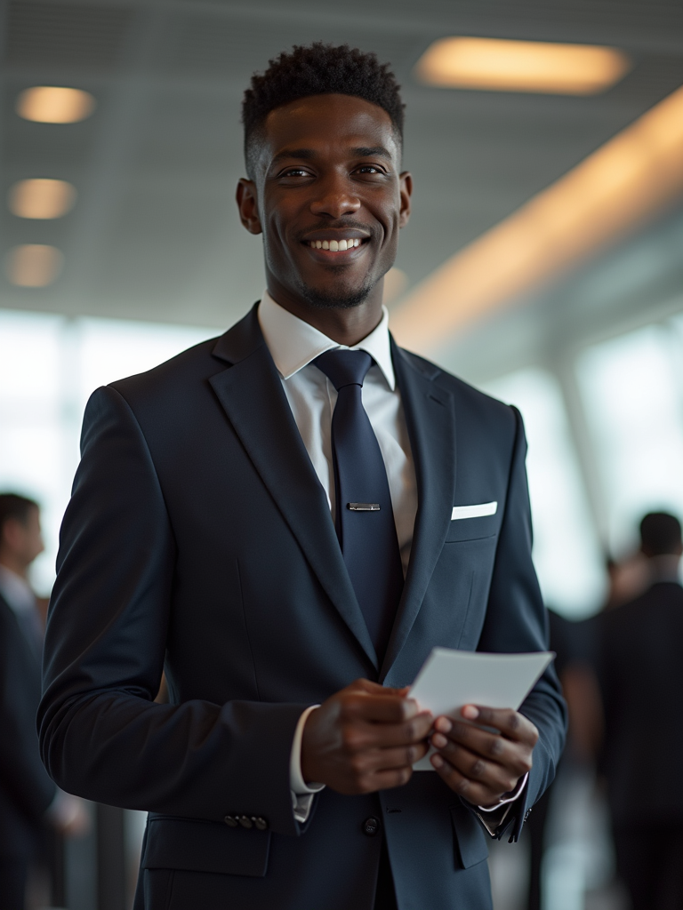 model as a flight attendant at boarding gate, wearing a commanding presence in a professional flight attendant uniform with groomed appearance and strong jawline, checking boarding passes