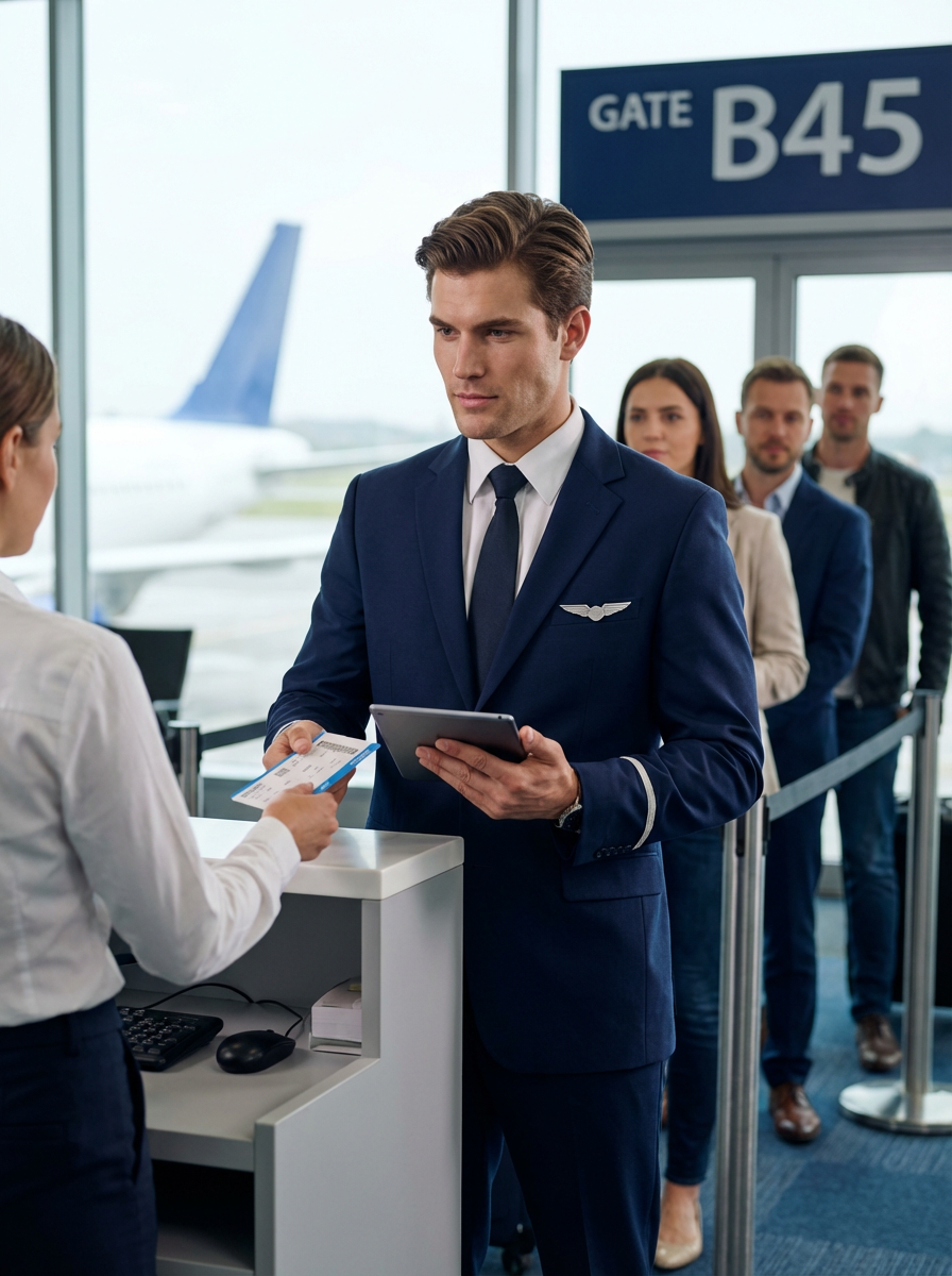 model as a flight attendant at boarding gate, wearing a commanding presence in a professional flight attendant uniform with groomed appearance and strong jawline, checking boarding passes
