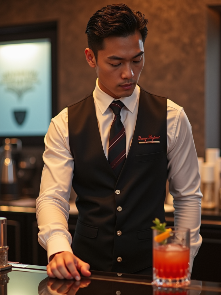 model as a flight attendant at onboard bar area, wearing a commanding presence in a sophisticated flight attendant uniform with tie and strong jawline, preparing specialty cocktails for passengers