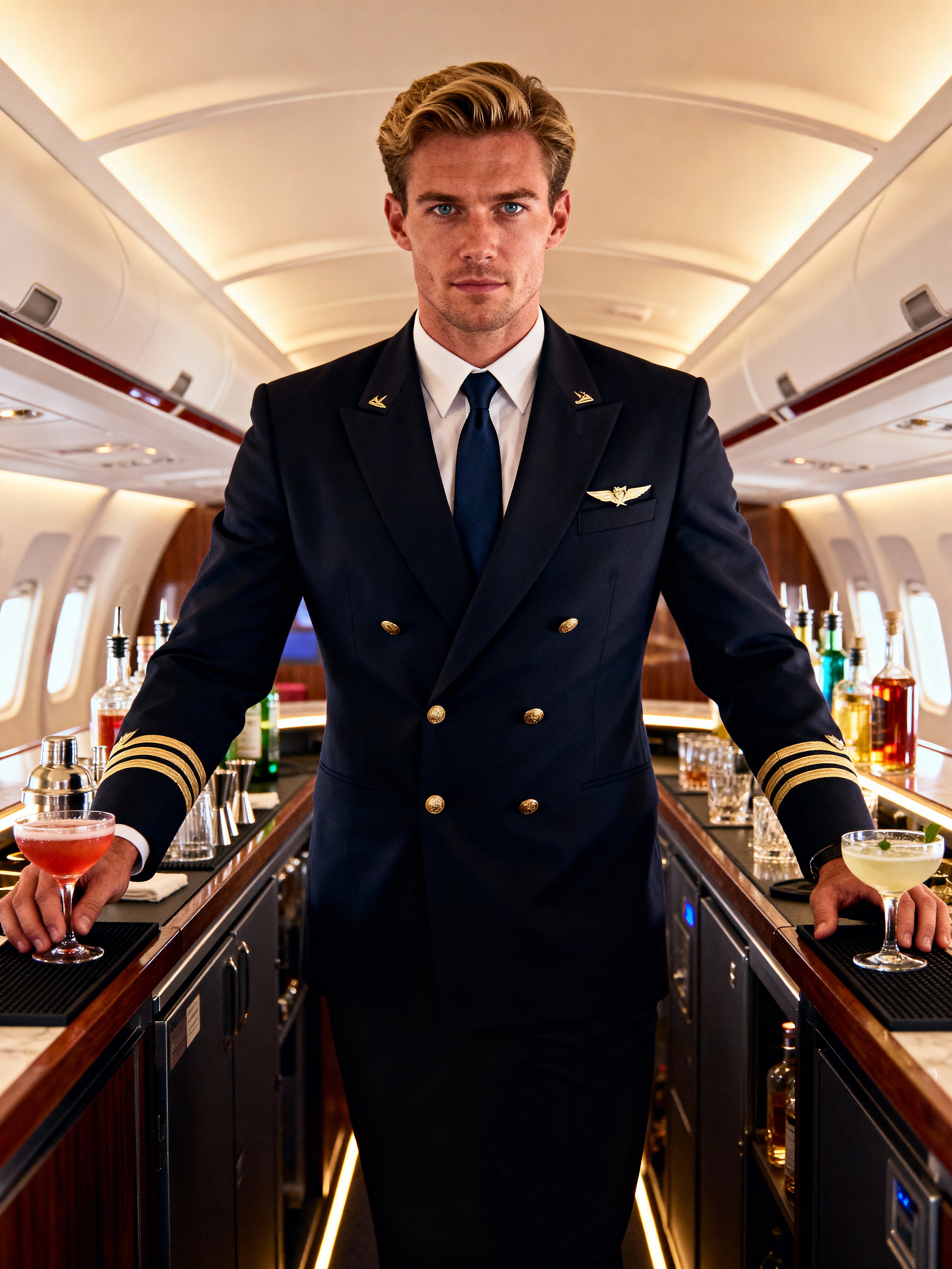 model as a flight attendant at onboard bar area, wearing a commanding presence in a sophisticated flight attendant uniform with tie and strong jawline, preparing specialty cocktails for passengers