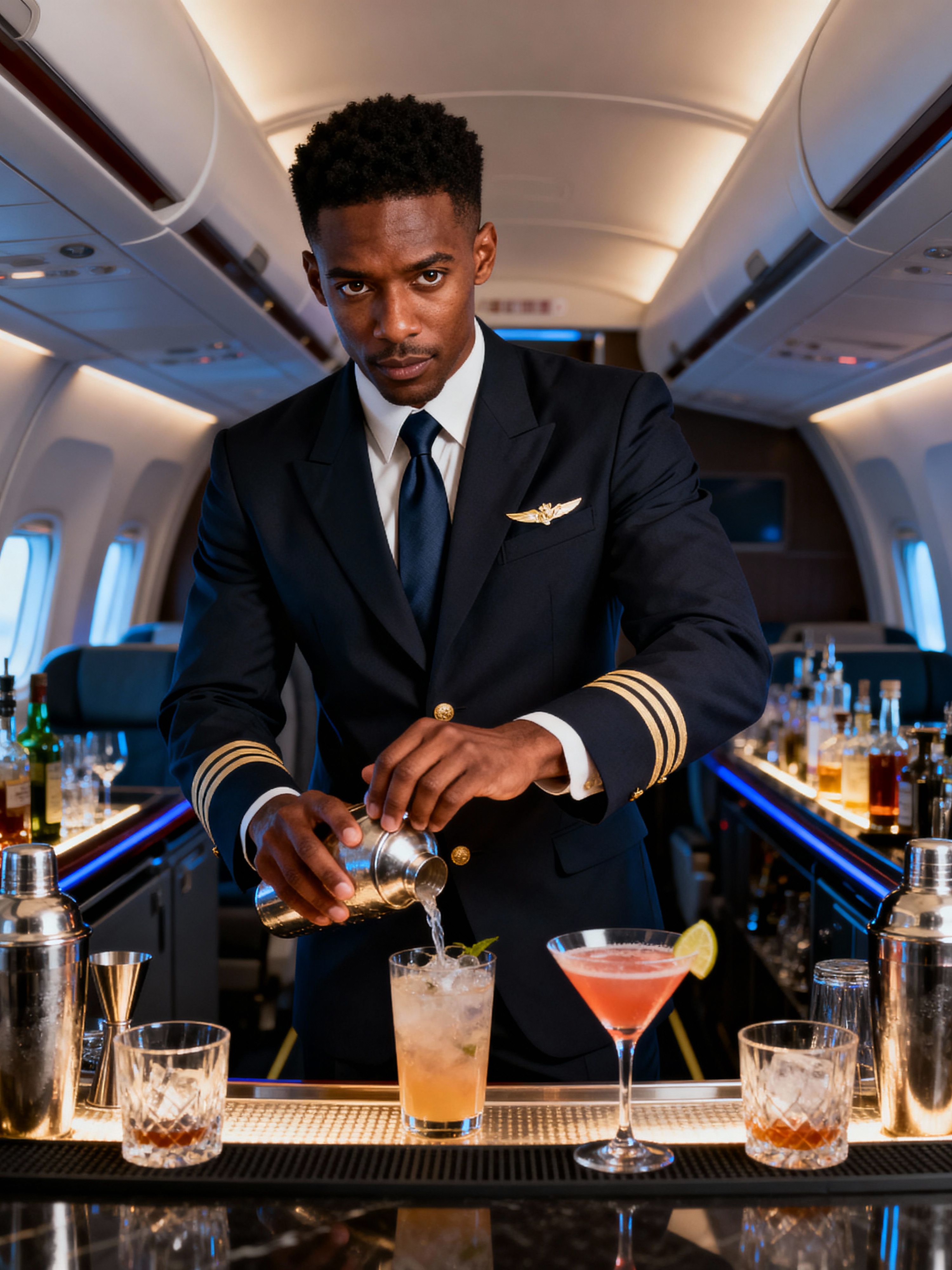 model as a flight attendant at onboard bar area, wearing a commanding presence in a sophisticated flight attendant uniform with tie and strong jawline, preparing specialty cocktails for passengers
