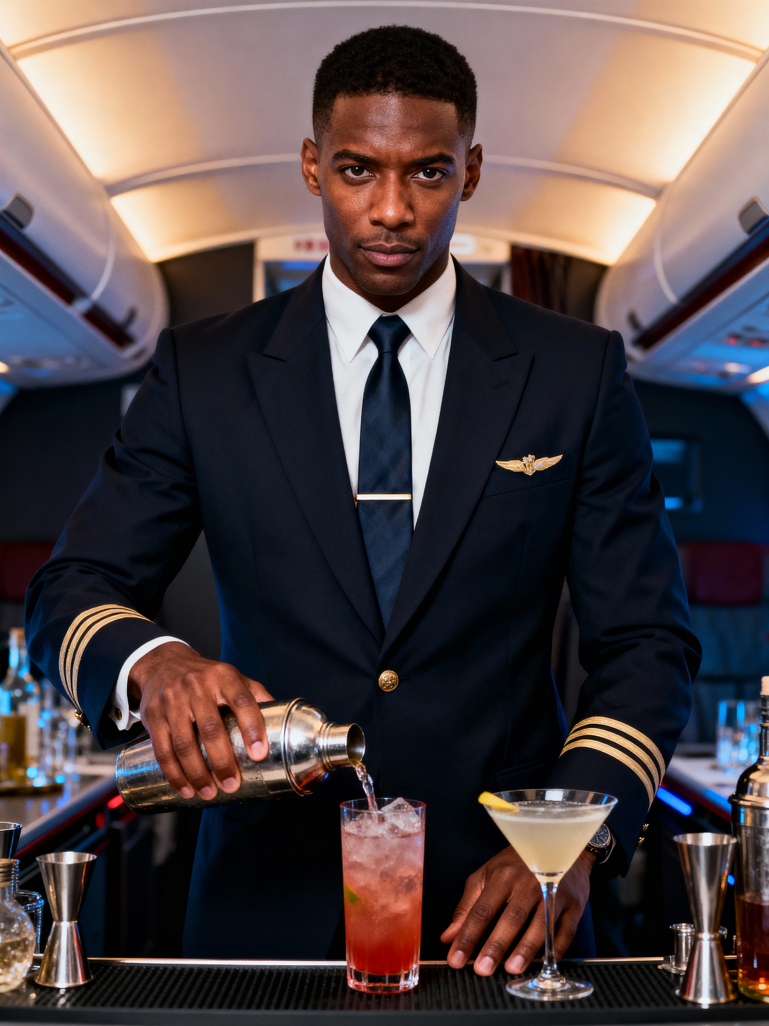 model as a flight attendant at onboard bar area, wearing a commanding presence in a sophisticated flight attendant uniform with tie and strong jawline, preparing specialty cocktails for passengers