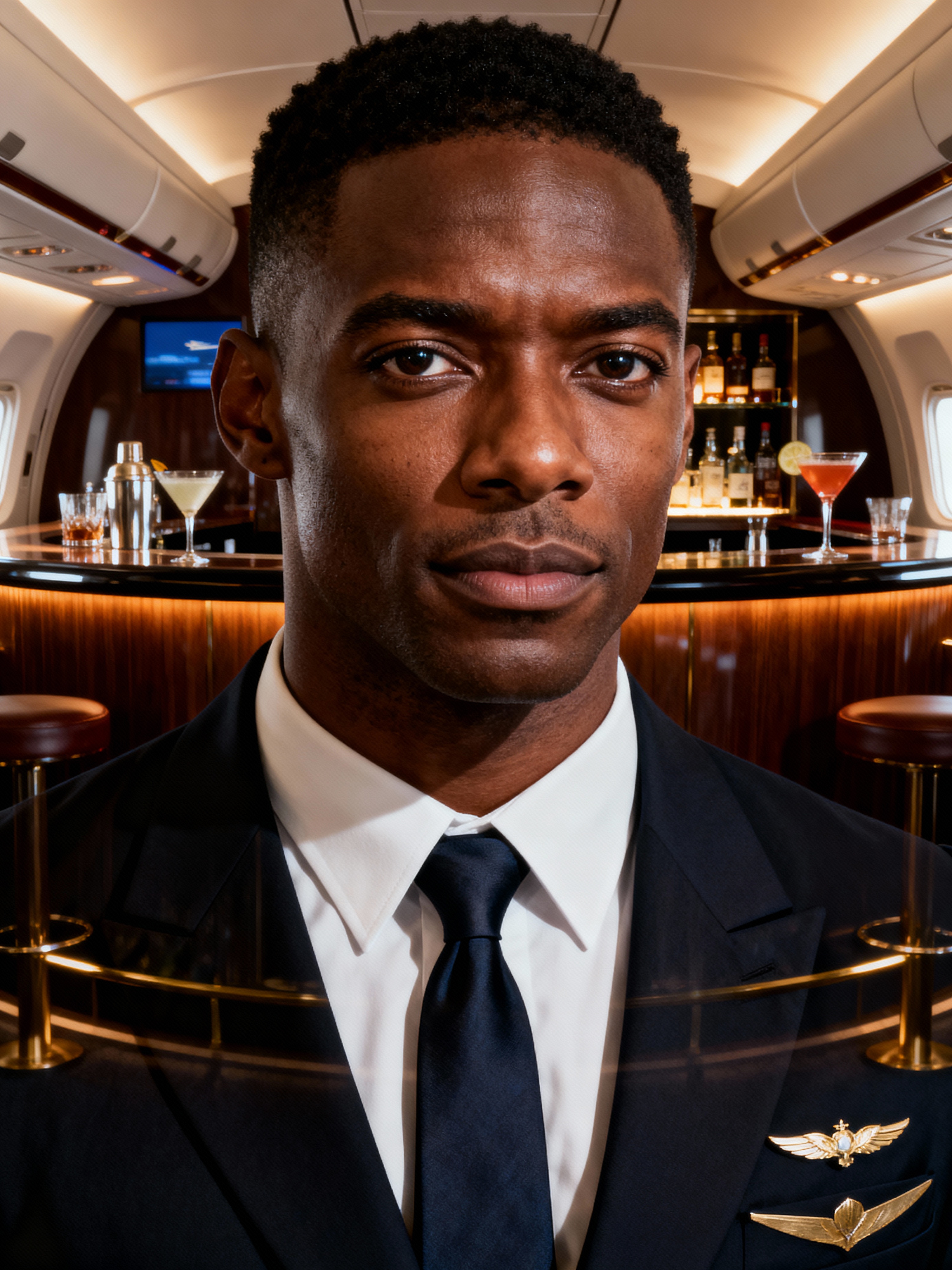 model as a flight attendant at onboard bar area, wearing a commanding presence in a sophisticated flight attendant uniform with tie and strong jawline, preparing specialty cocktails for passengers