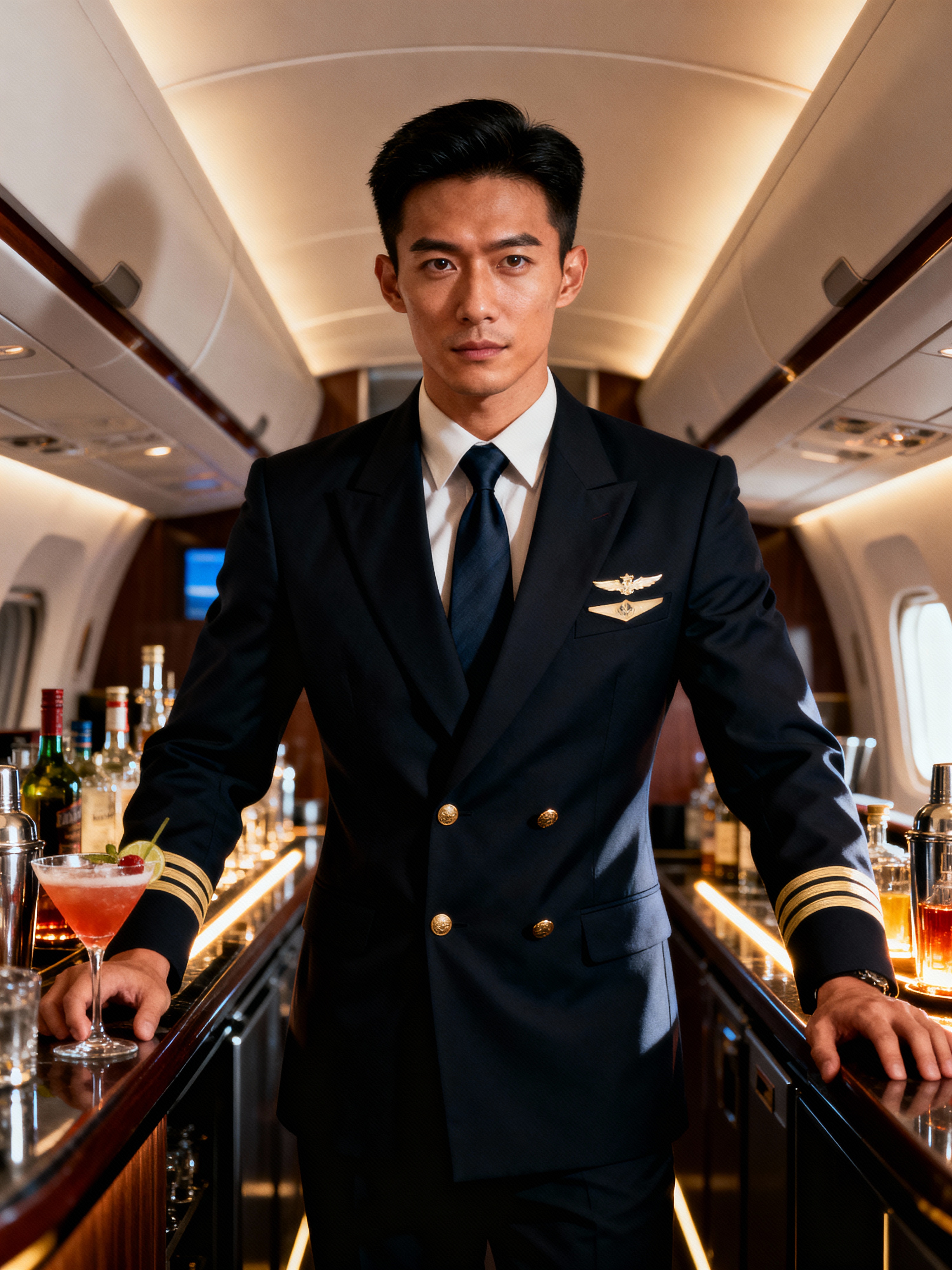 model as a flight attendant at onboard bar area, wearing a commanding presence in a sophisticated flight attendant uniform with tie and strong jawline, preparing specialty cocktails for passengers