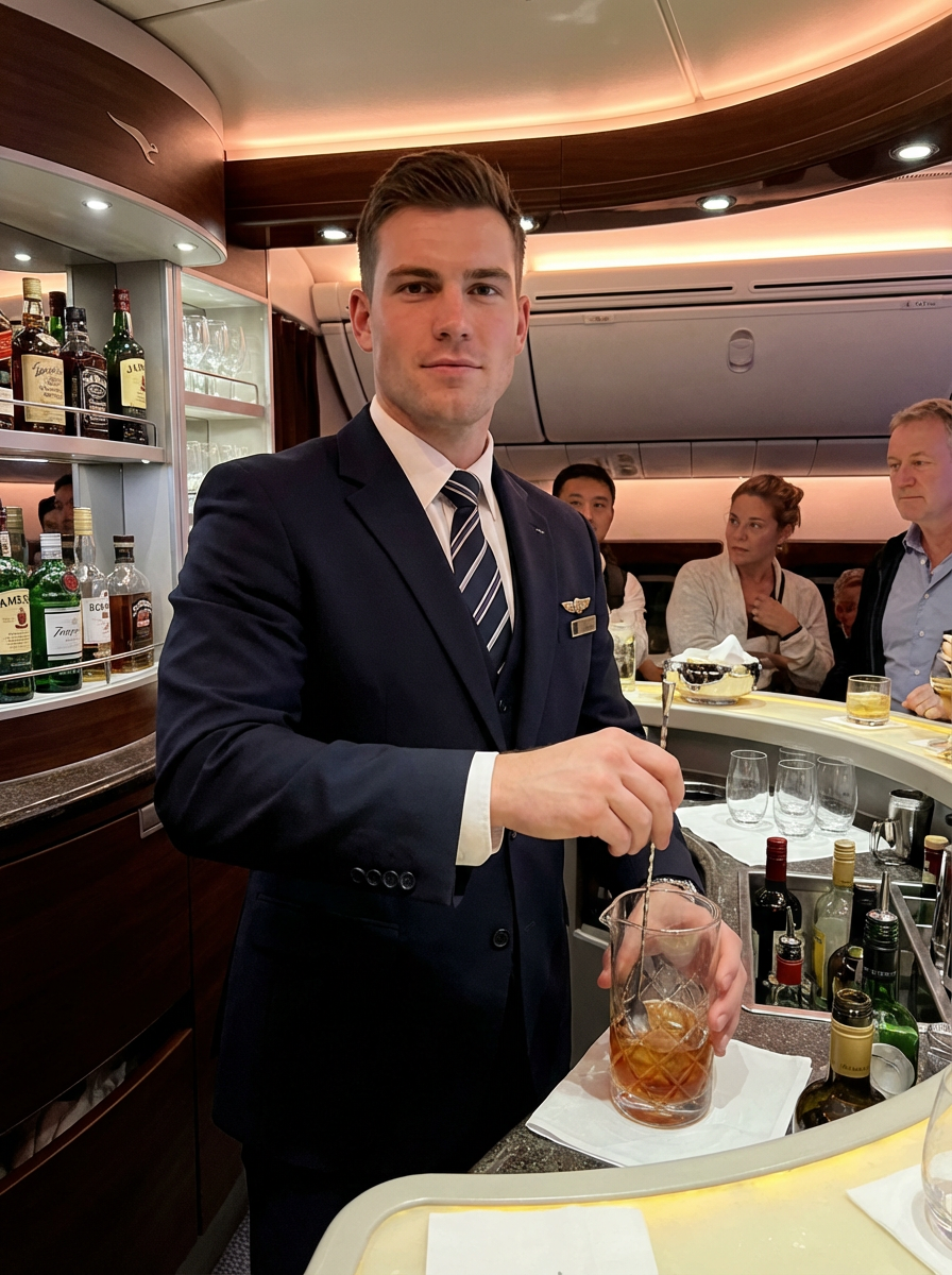 model as a flight attendant at onboard bar area, wearing a commanding presence in a sophisticated flight attendant uniform with tie and strong jawline, preparing specialty cocktails for passengers